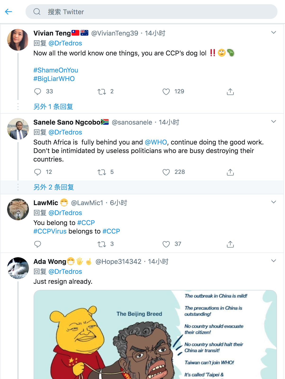twitter搜索谭德赛,随手点开一篇他呼吁跨党派合作救人、不要政治化的推文,下方评论图文并茂