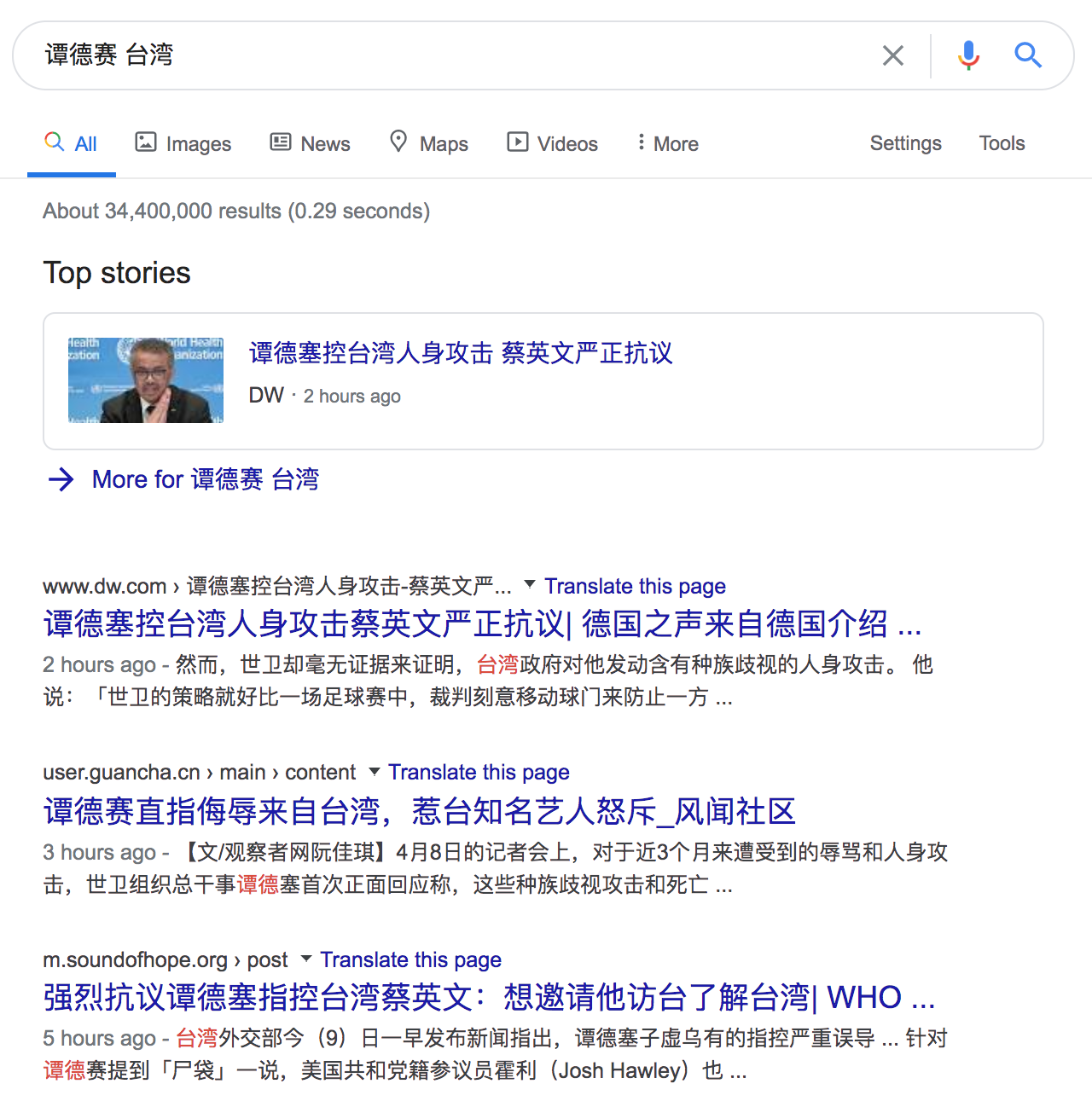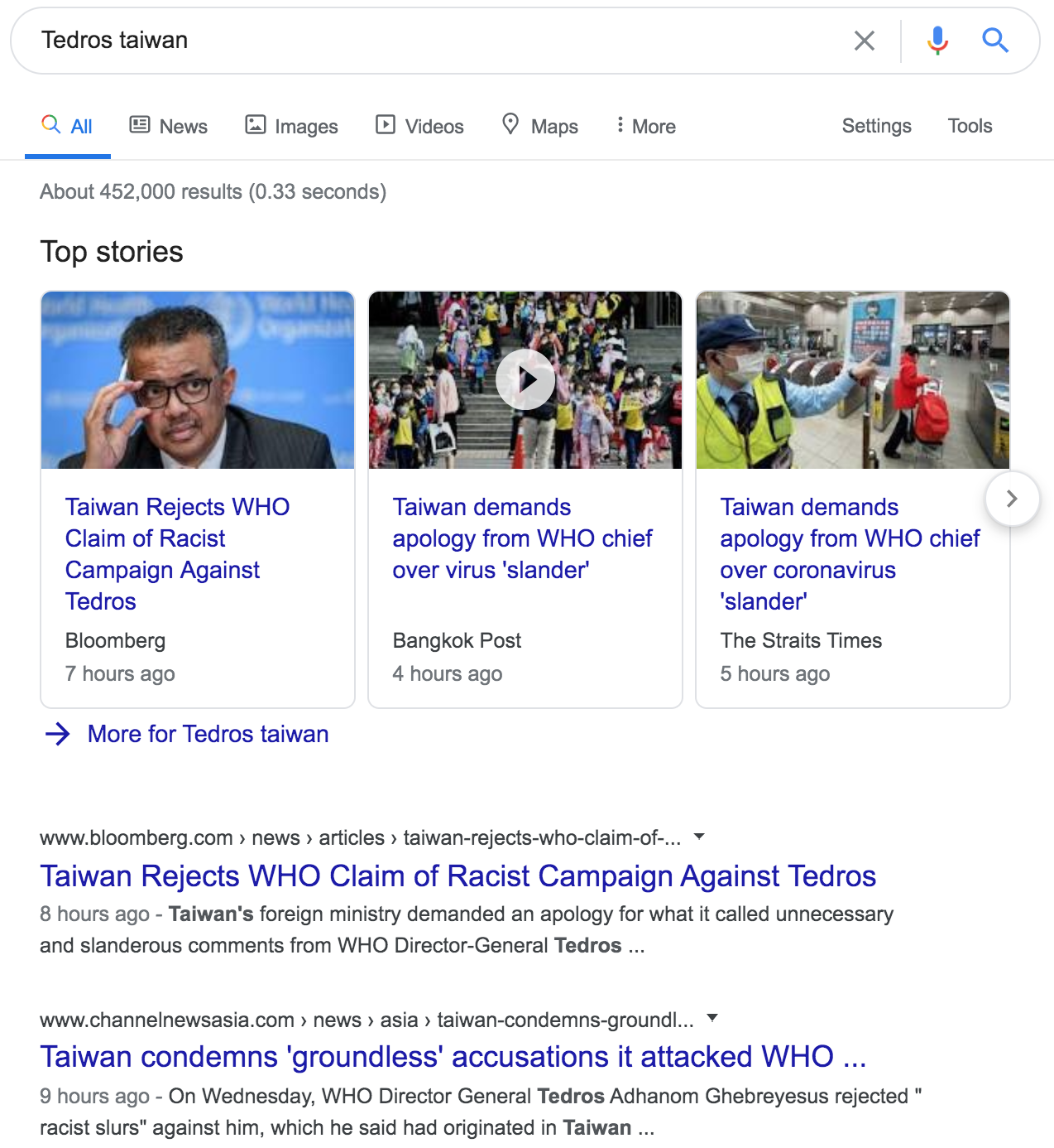 Google英文搜索,可以注意到包括小坡英媒的标题("台湾要求道歉"、"台湾谴责不实指控")