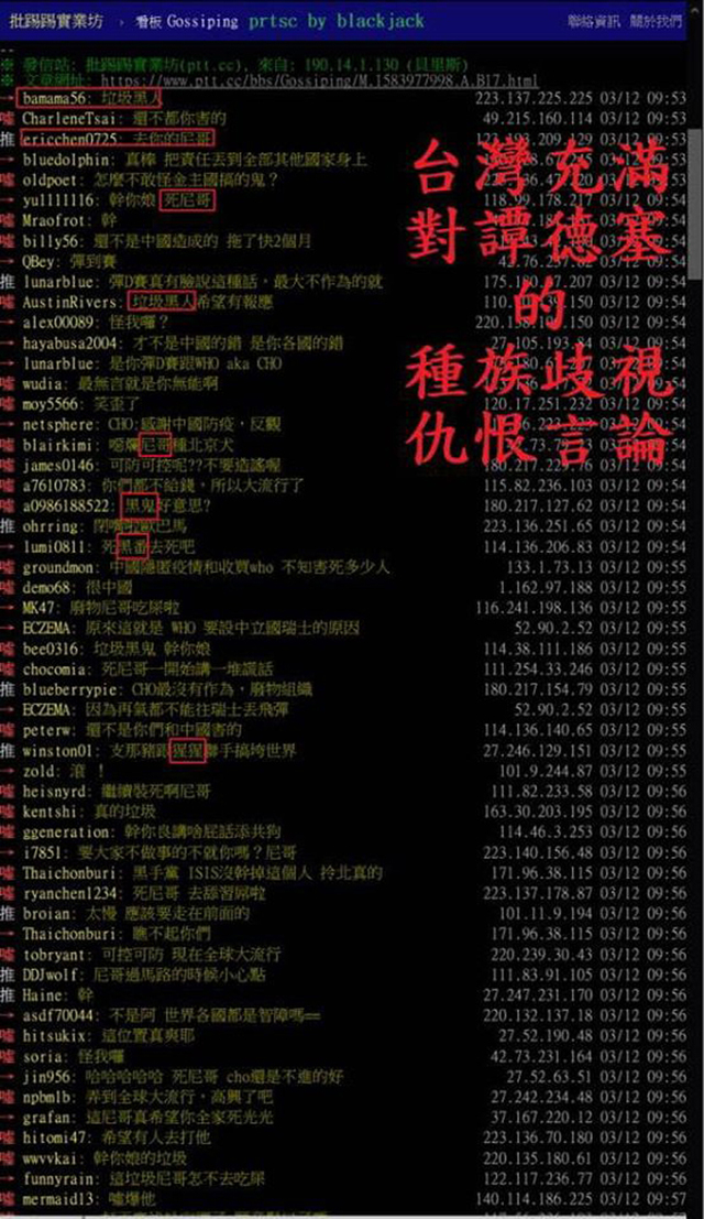 在台湾的一片驳斥声中,非主流党派借机发出一点非主流声音:"武漢肺炎疫情延燒全球,世界衛生組織(WHO)遭批袒護中國、延誤防疫,WHO秘書長譚德塞(Tedros Adhanom Ghebreyesus)宣稱3個月來遭到辱罵威脅、種族歧視,更點名「攻擊就是來自台灣」,台灣從政府到民間一片駁斥聲浪,但新黨台北市議員侯漢廷聲援譚德塞,秀出擷圖證明台灣網友辱罵譚德塞,更指台灣政府對此視而不見。"