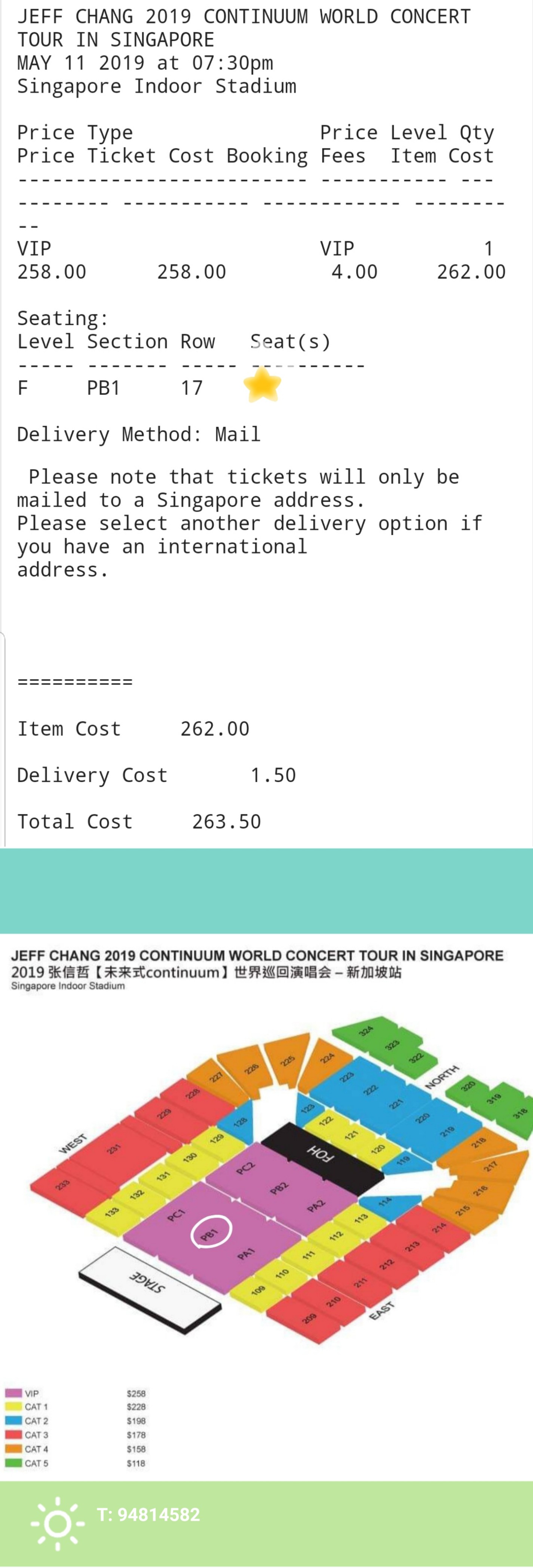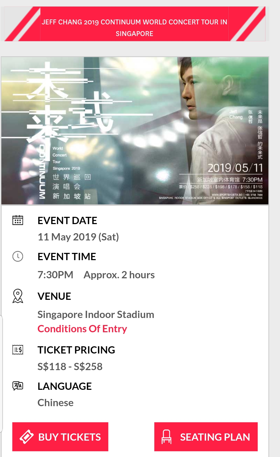他的演唱会在新加坡就一场,5月11号周六晚,Singapore Indoor Stadium。