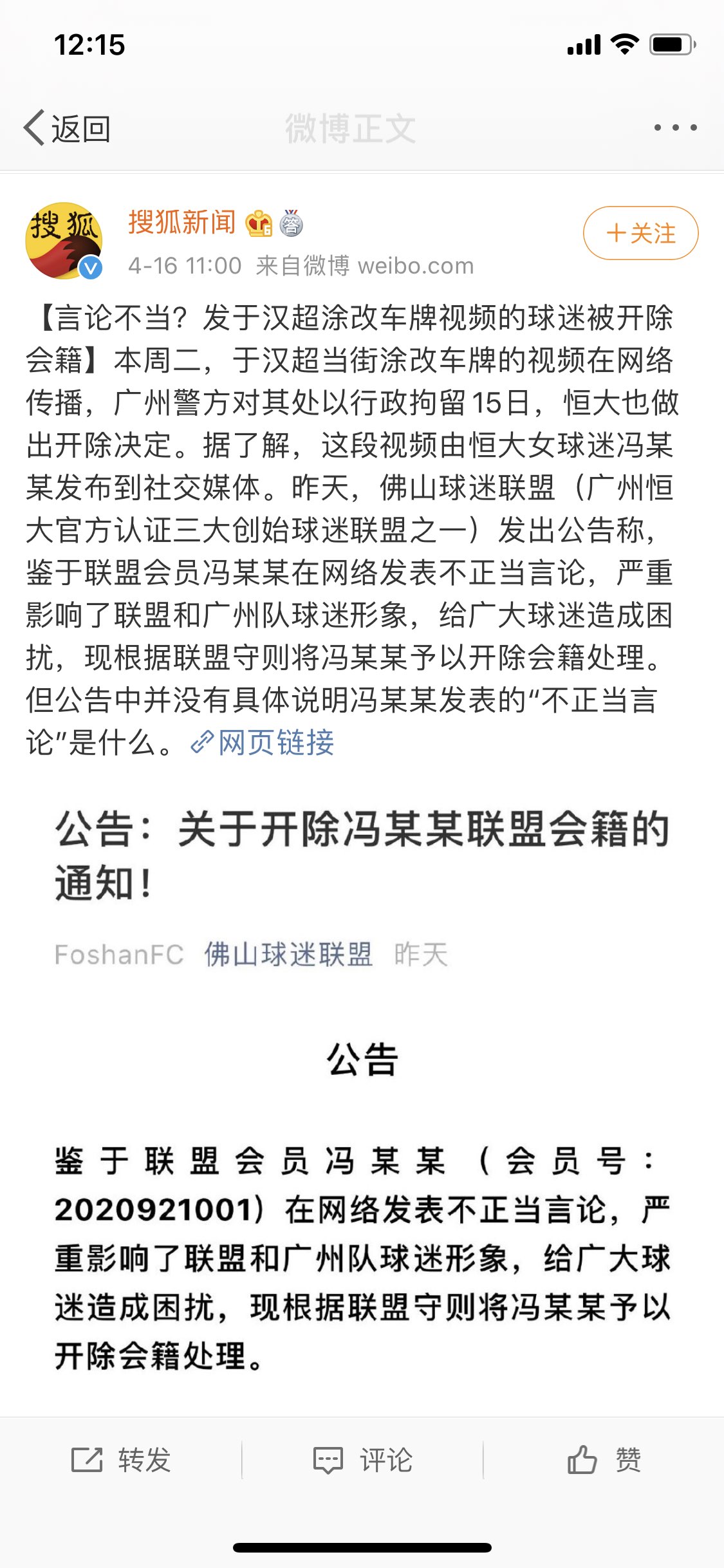 rjm • • 13800 次浏览4月14日,有网友拍到广州恒大球员于汉超在街道上修改机动车号牌,在社交平台引发热议。随后,广州警方通报:罚款5000元、行政拘留15日。晚11点广州恒大官方宣布开除于汉超!
