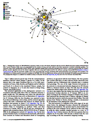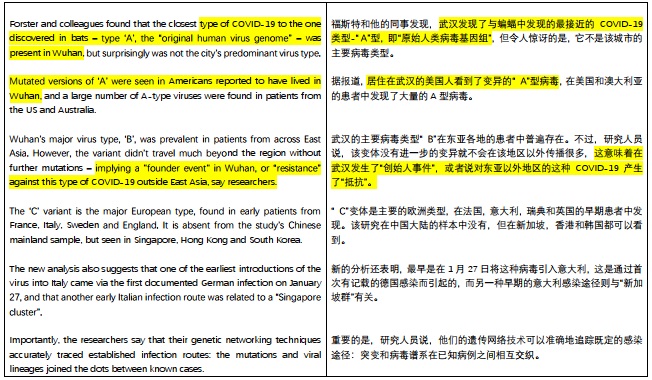 福斯特的论文分析了160个完整的新冠病毒全基因组。根据突变分析,研究人员将新冠病毒分为A型、B型和C型。其中A型与蝙蝠和穿山甲身上发现的病毒最为接近,是原始病毒类型,B型演化自A,C型演化自B。