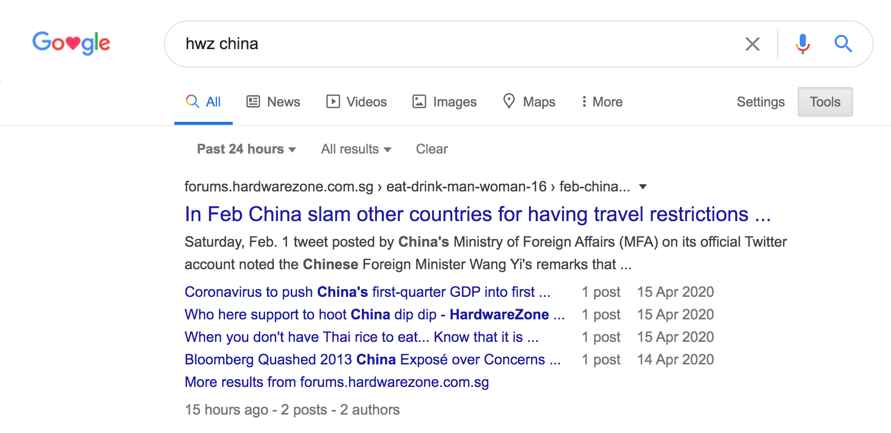 举个例子,本地最大的生活论坛HWZ,G搜一下最近24小时和中国有关的主题,如下: