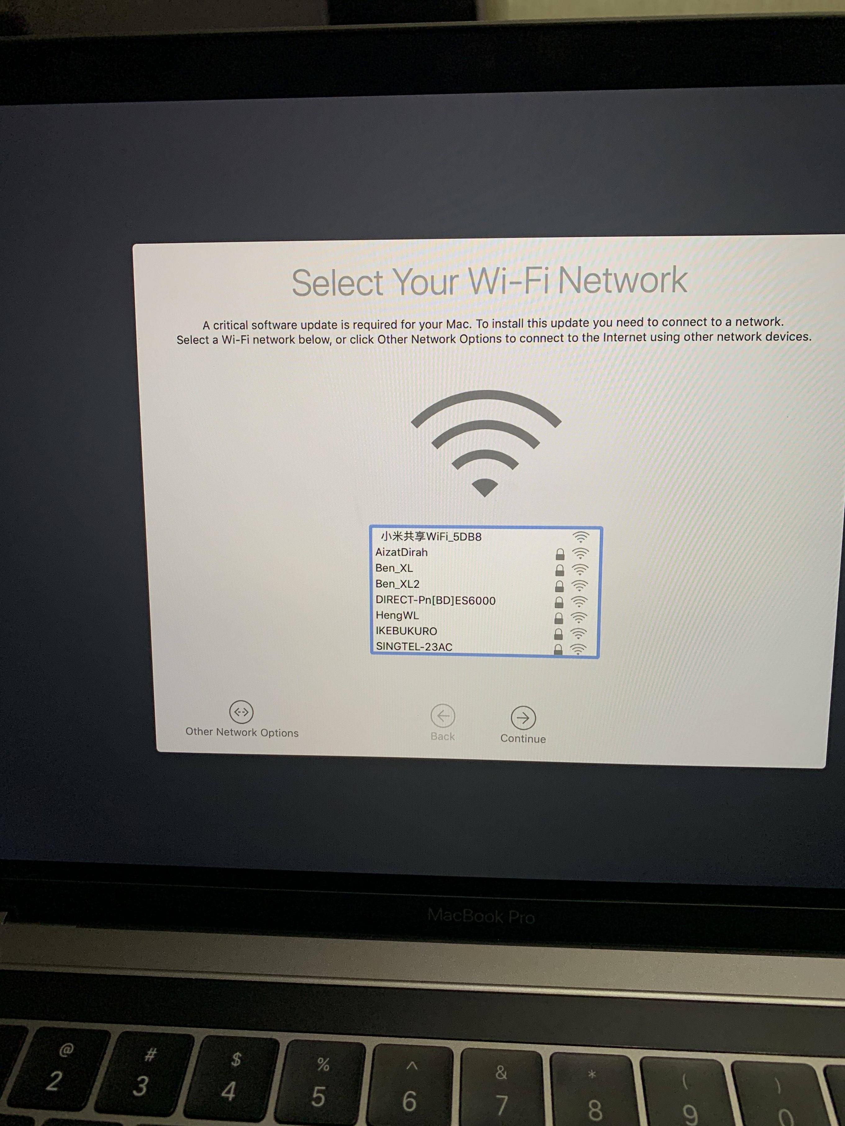 连网线试试看。那个 critical update 是给 touch bar 的。touch bar 多出来不少事,自带芯片,自带 firmware 优先级还高于系统。