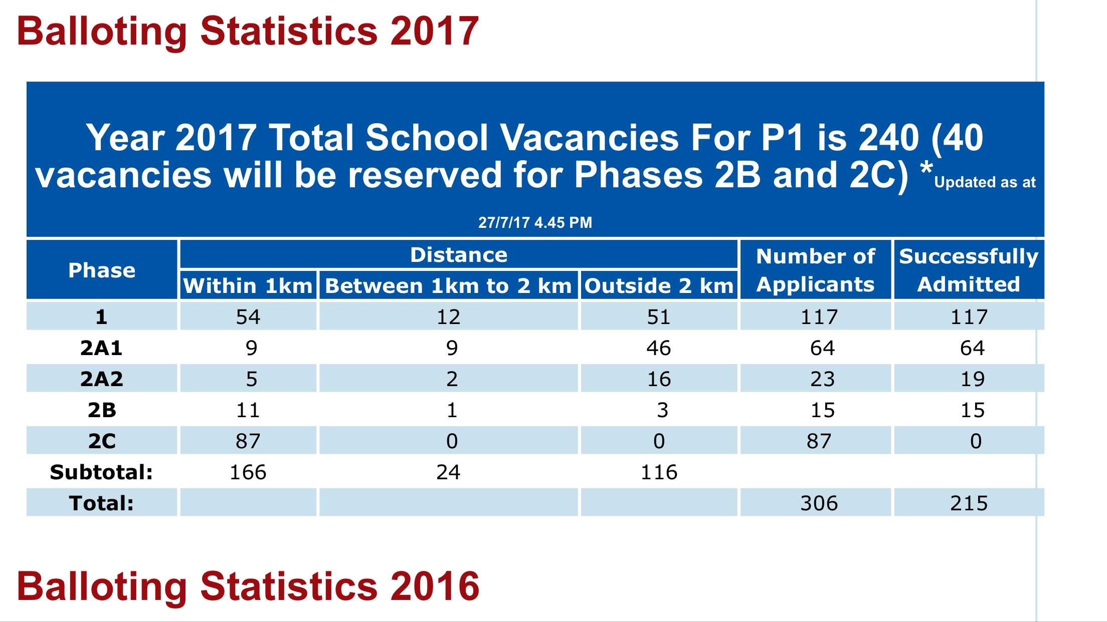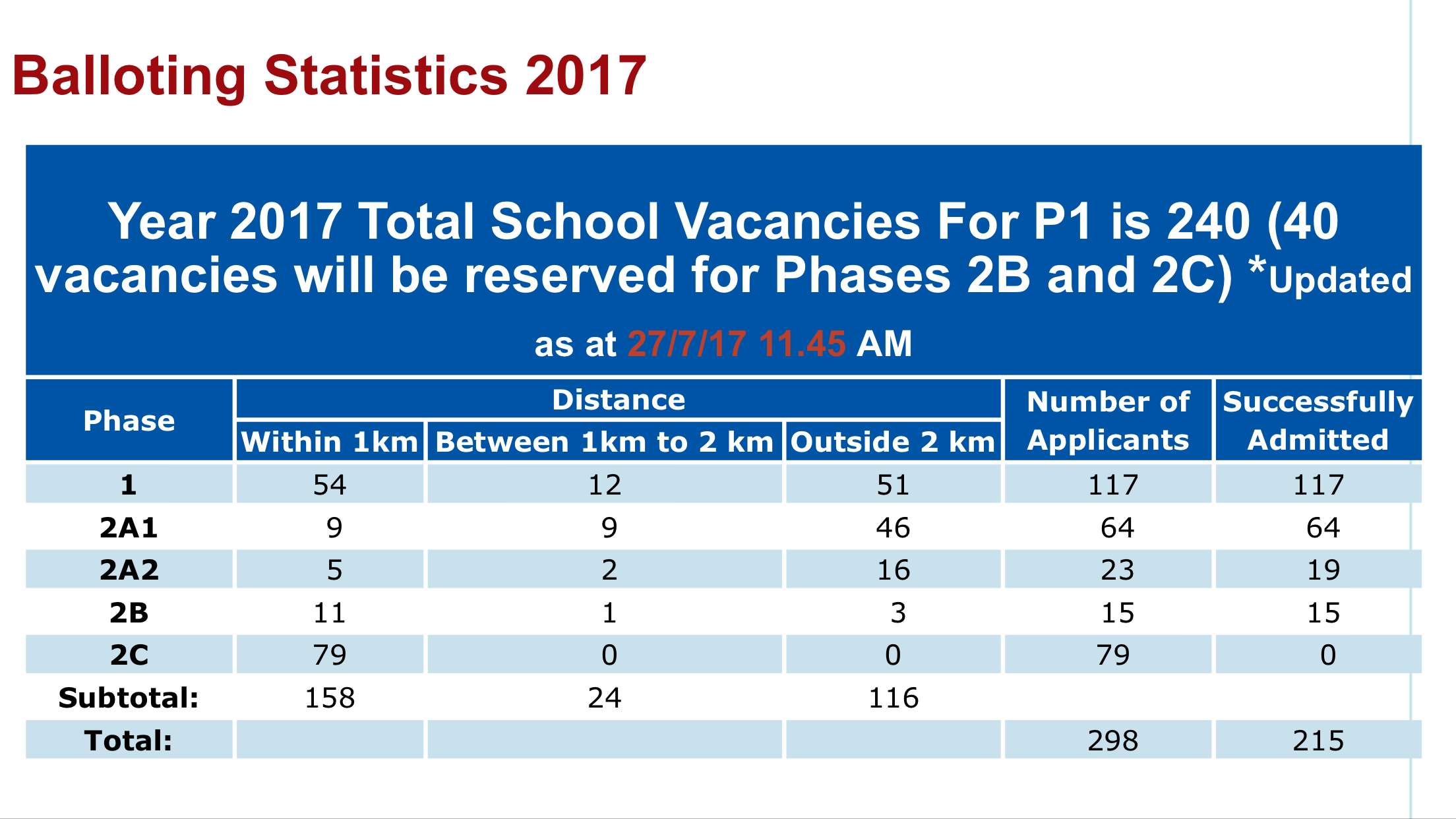 南华小学2c报名第二天,一公里之内的报名已经有79个了。由于2b剩了5个名额给2c,所以2c有25个名额。如果明天再增加几个报名,抽签成功率会低过30%。如果不做社区义工,就是买了Triling的公寓房,也很难上的了一墙之隔的南华小学。还是2b报上南华小学更靠谱,去年和今年,只要有资格参加南华小学的2b报名,无论是公民还是PR,无论是住在一公里之内还是两公里之外,都报上了。。。