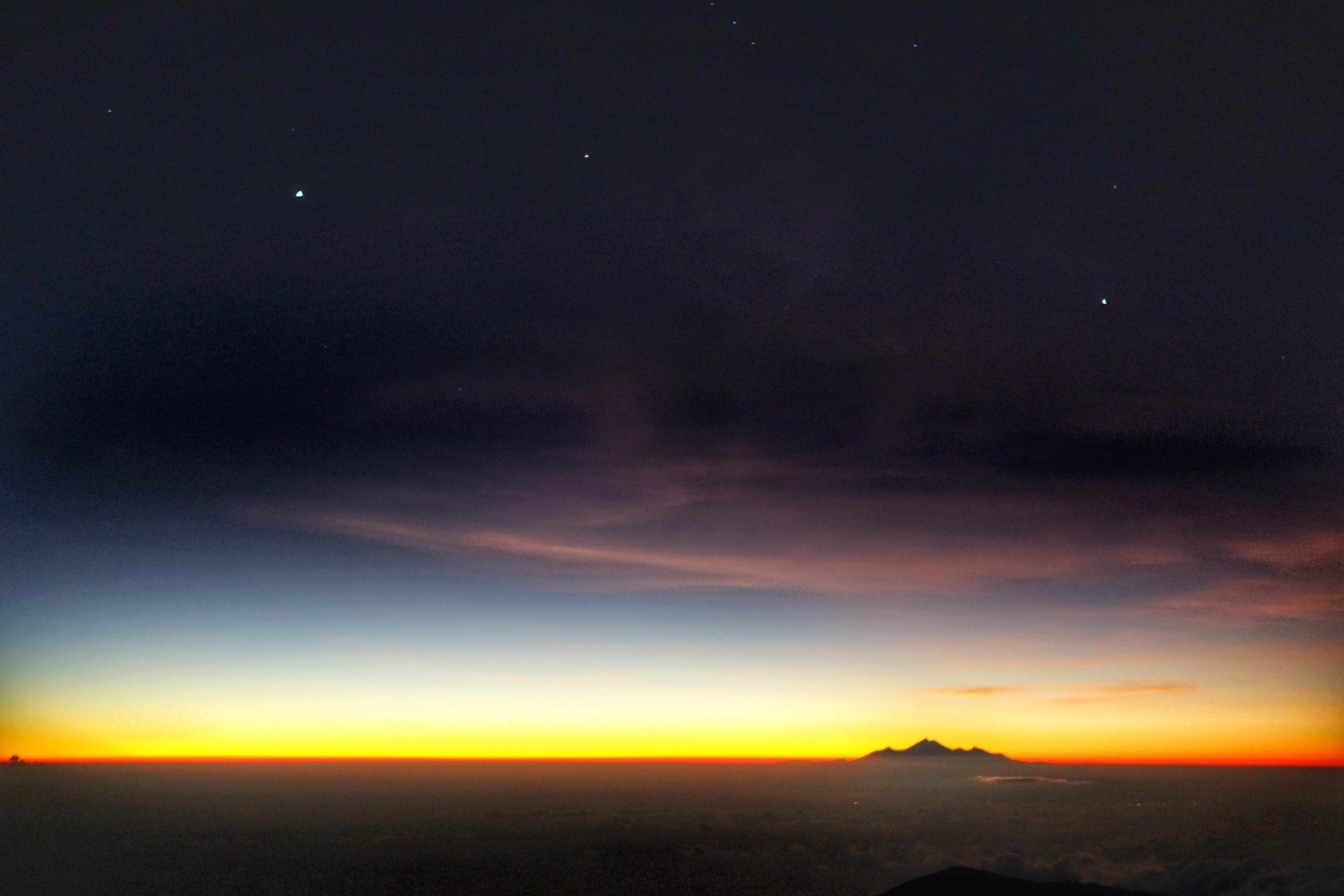 日出前日出时间六点半,我五点四十上来的时候看到远处的rinjani火山的影子映衬隐约的霞光和夜幕间的星辰