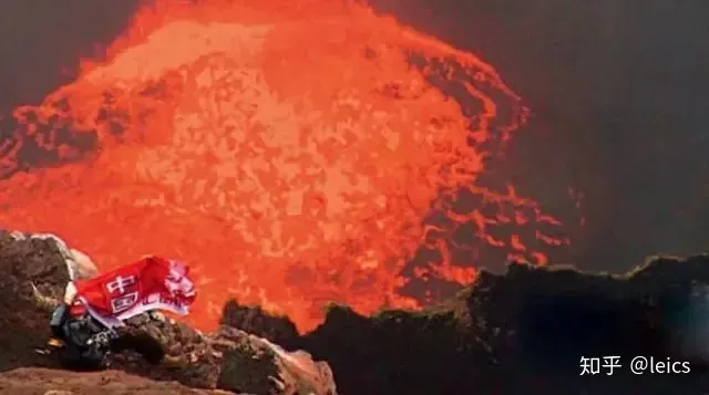 在滚沸的岩浆池边举起“中国”的旗帜,