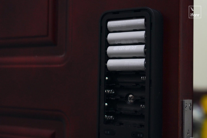门锁的电池仓是 8 颗电池的槽位,但实际上 4 颗电池就已经可以开启门锁并正常工作。