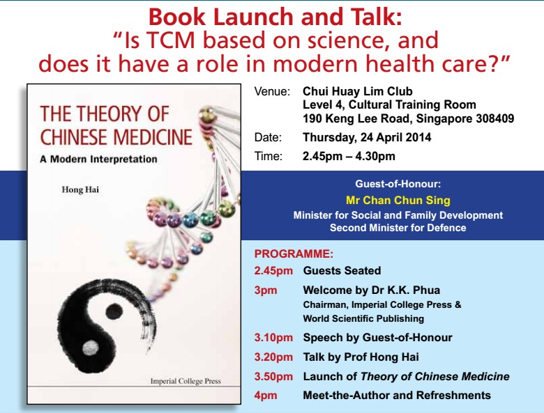 Chairman, Imperial College Press & World Scientific Publishing3.10pmSpeech by Guest-of-Honour3.20pmTalk by Prof Hong Hai3.50pmLaunch of Theory of Chinese Medicine4pmMeet-the-Author and Refreshments About the AuthorHong Hai is Adjunct Professor and Senior Fellow at the Institute of Advanced Studies, Nanyang Technological University. Trained originally in engineering and economics, he was chief executive of a pharmaceutical and leisure group and later studied Chinese medicine and the philosophy of science, graduating with an MD (Beijing University of Chinese Medicine), MPhil (Cambridge) and PhD (London). His doctoral dissertation critically examined the scientific basis for Chinese medical theory. Professor Hong Hai has chaired the Government Parliamentary Committee on Health, and was a member of the TCM Practitioners Board and chairman of its academic committee. He practises medicine part-time at the Public Free Clinic and the Renhai Clinic.