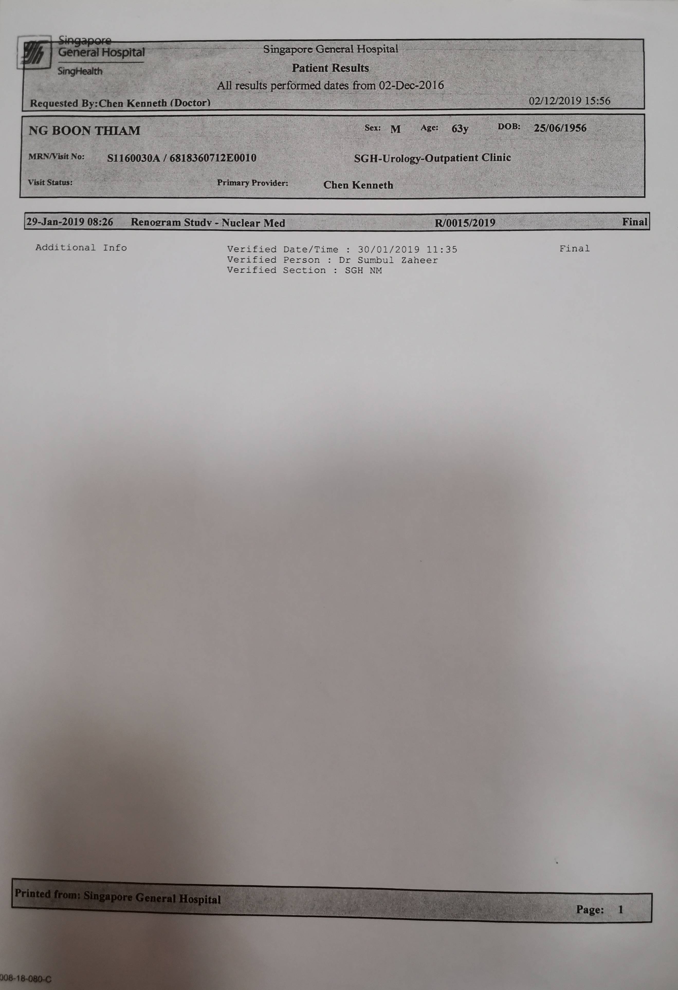 29-01-2019做完了特别检查肾脏。20-02-2019 又来看医生了解析全部報告。轮到了我要进去看医生时间,有位20多岁的男人走出来,还跟我打招呼,那时我也没在意他,我进去了,医生说我的左边的肾功能没有坏。记得还未照膀胱镜时,医生说照了膀胱镜就会知道70年动过什么手术,现在医生闭谈我的病况,我又不知如何问他,只好要他写全部报告给我 ( CT、膀胱镜、特别肾检查)。我说女儿要知道。他说我的女儿要知道可直接来问他,我说我女儿在瑞士,我现在打电话给她,医生说现在很没空。