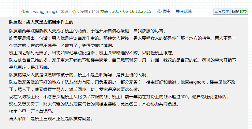 看楼主的回答和口气,我猜的不一定准哈爸爸自我感觉良好,因为是家庭主要财务收入者,估计又是家里说的算的。