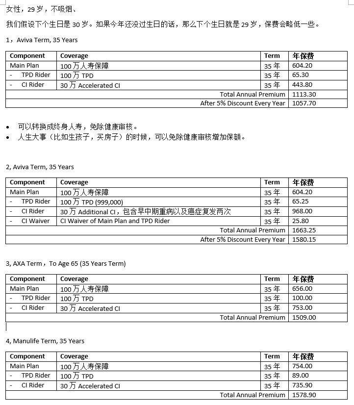 humeimei • • 37008 次浏览如题,想要买100万的Term Life, 女性,29岁,覆盖如下: