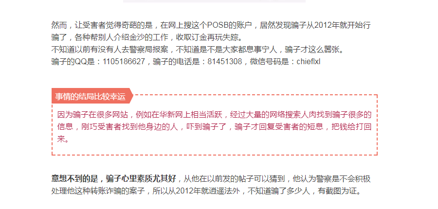 这样的老骗子了,既然已经被人肉出来了,为什么不在网站上曝光呢?骗子骗人都不怕被警察抓,期待赶快有人曝光这个骗子的信息,比如名字,在哪里公司等。