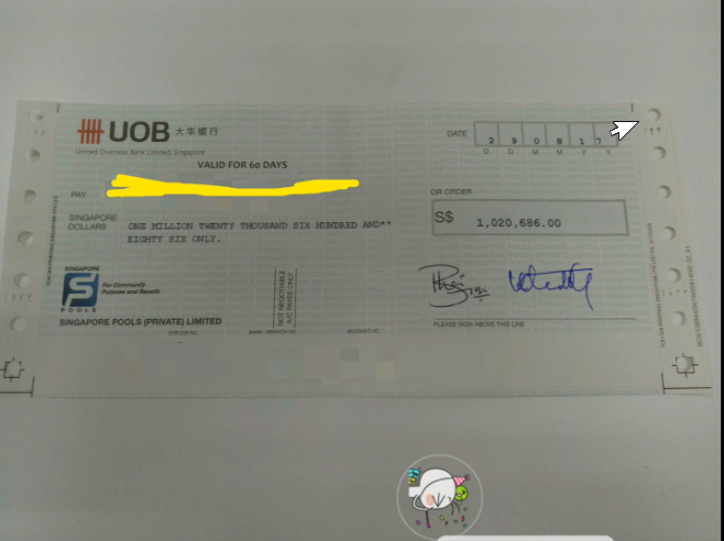以我中奖的经验告诉我, 三百千, 七百千, 支票都是三个人签署的.这张支票过1M才两个人签署? Anyway, 祝你好运.