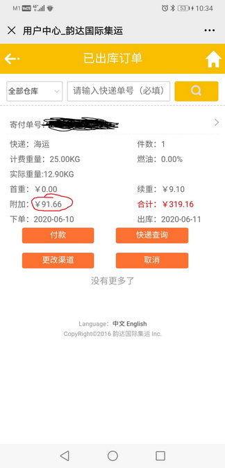 我想提醒的是:1. 这个附加费,无论是在它的收费标准页面上,还是在跟客服的前期交流中,都没有提到有这个收费2. 账单出来后,我问客服这个附加费是什么收费标准,客服说不清楚,是系统自动计算的,可能是打包和快递的费用。也就是说,是系统自动的“黑箱操作”,连客服都不知道是怎么回事3. 这次是90多块的附加费,下次可能就是900多,谁也不知道应该是多少。你的货已经在韵达仓库了,多少钱你都得付4. 在所有我用过的物流公司里,只遇到过《韵达集运》收附加费。没有收费标准的附加费,更是闻所未闻。
