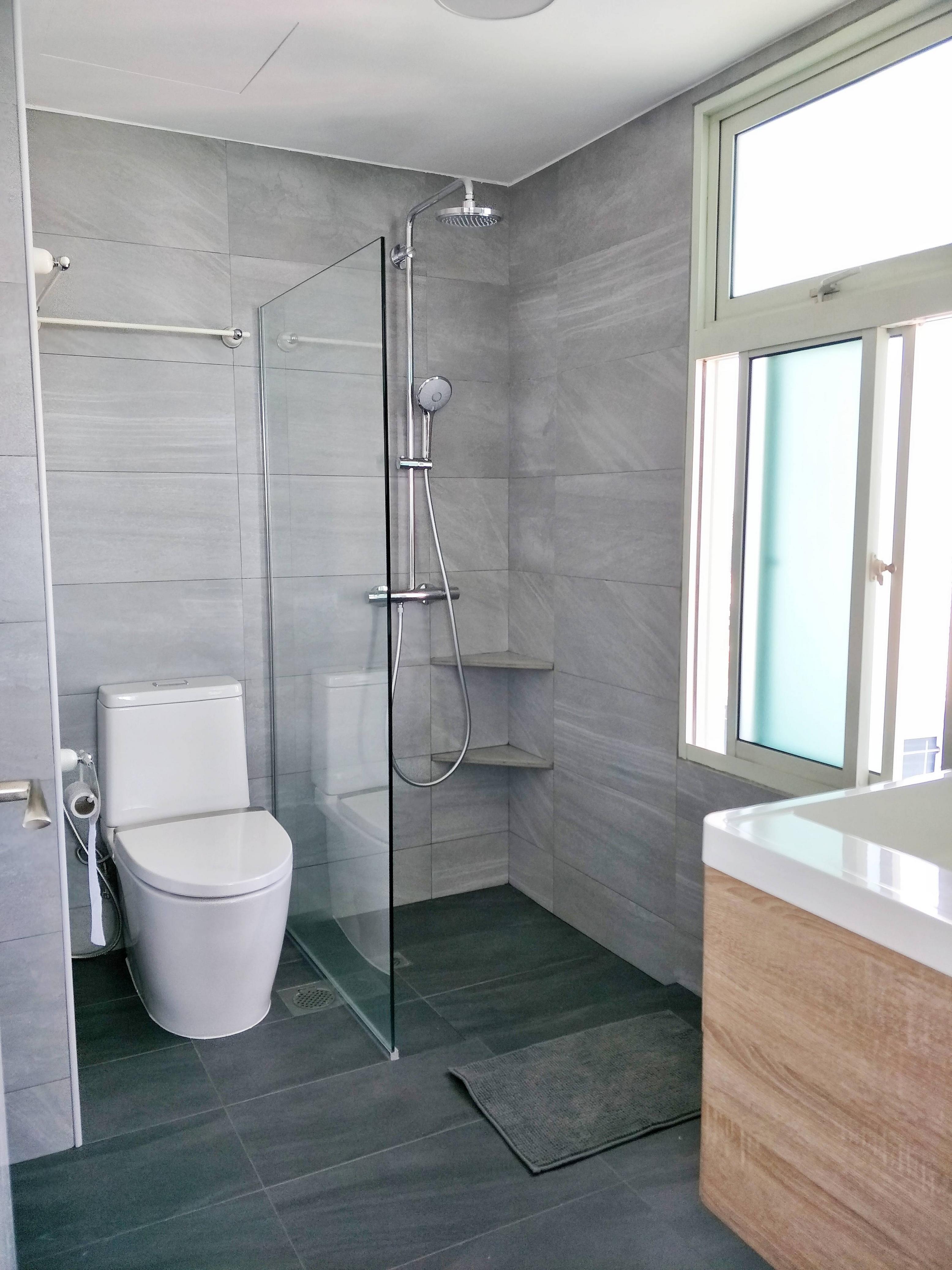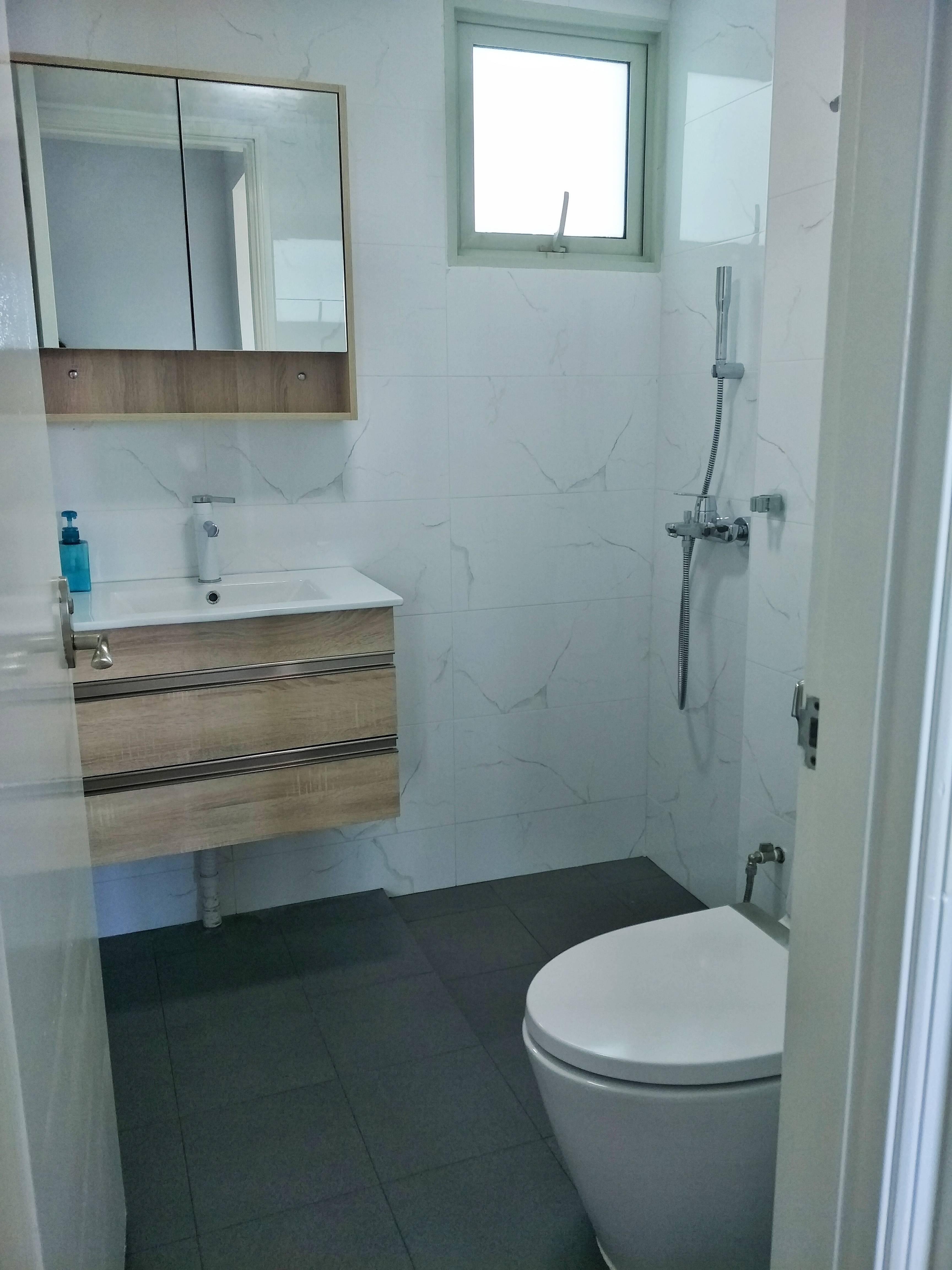 卫生间来几张,浴室柜都是国内买的主卫有一个大窗户,很亮堂且通风很好, 所以铺了灰色砖,五金尽量用白de
