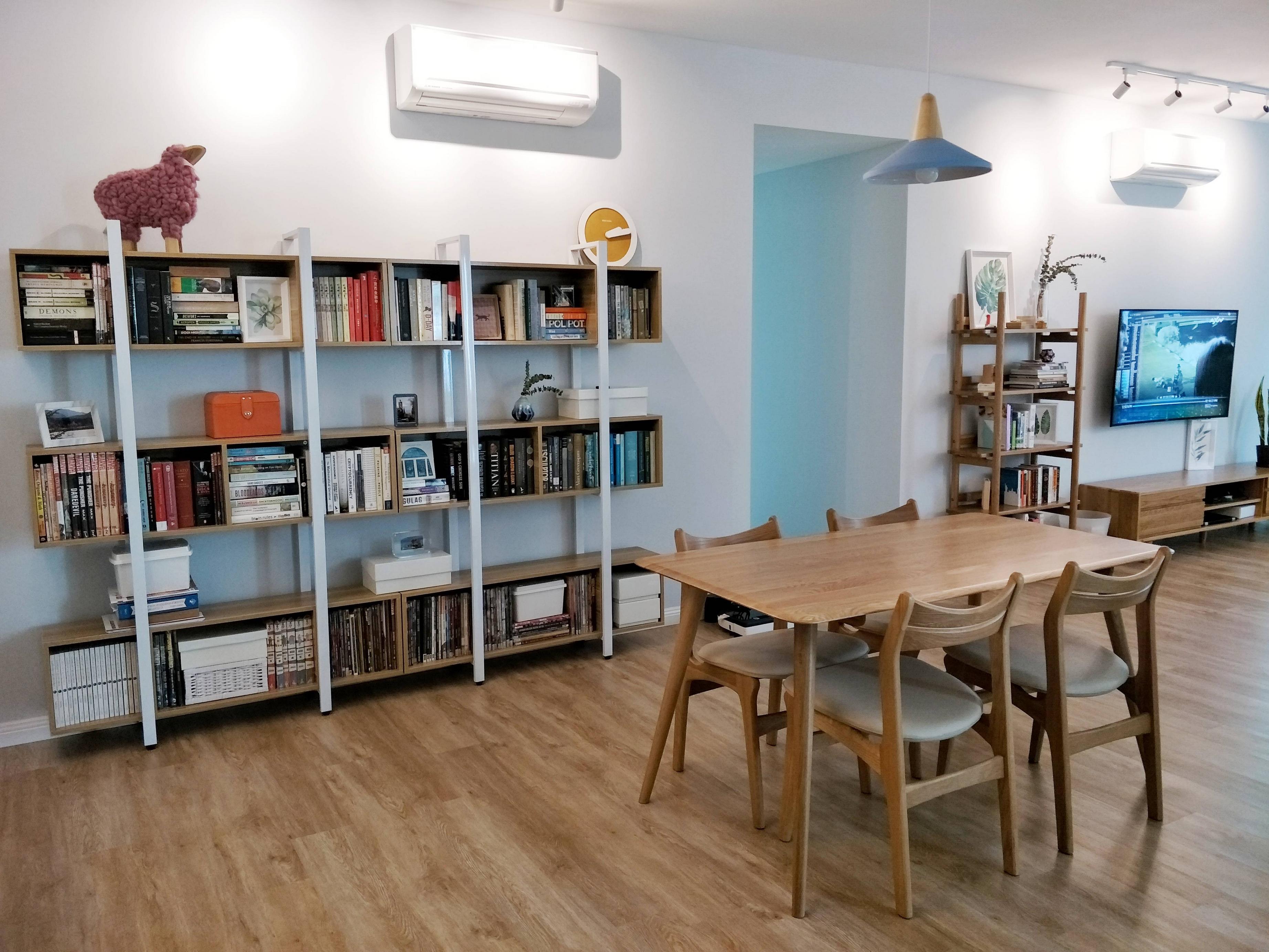我也觉得地板铺的方向看着有点怪,不过不影响整体小清新的赶脚,就是那么多架子格子,看着好看,替楼主以后打扫卫生担心,哈哈哈 -