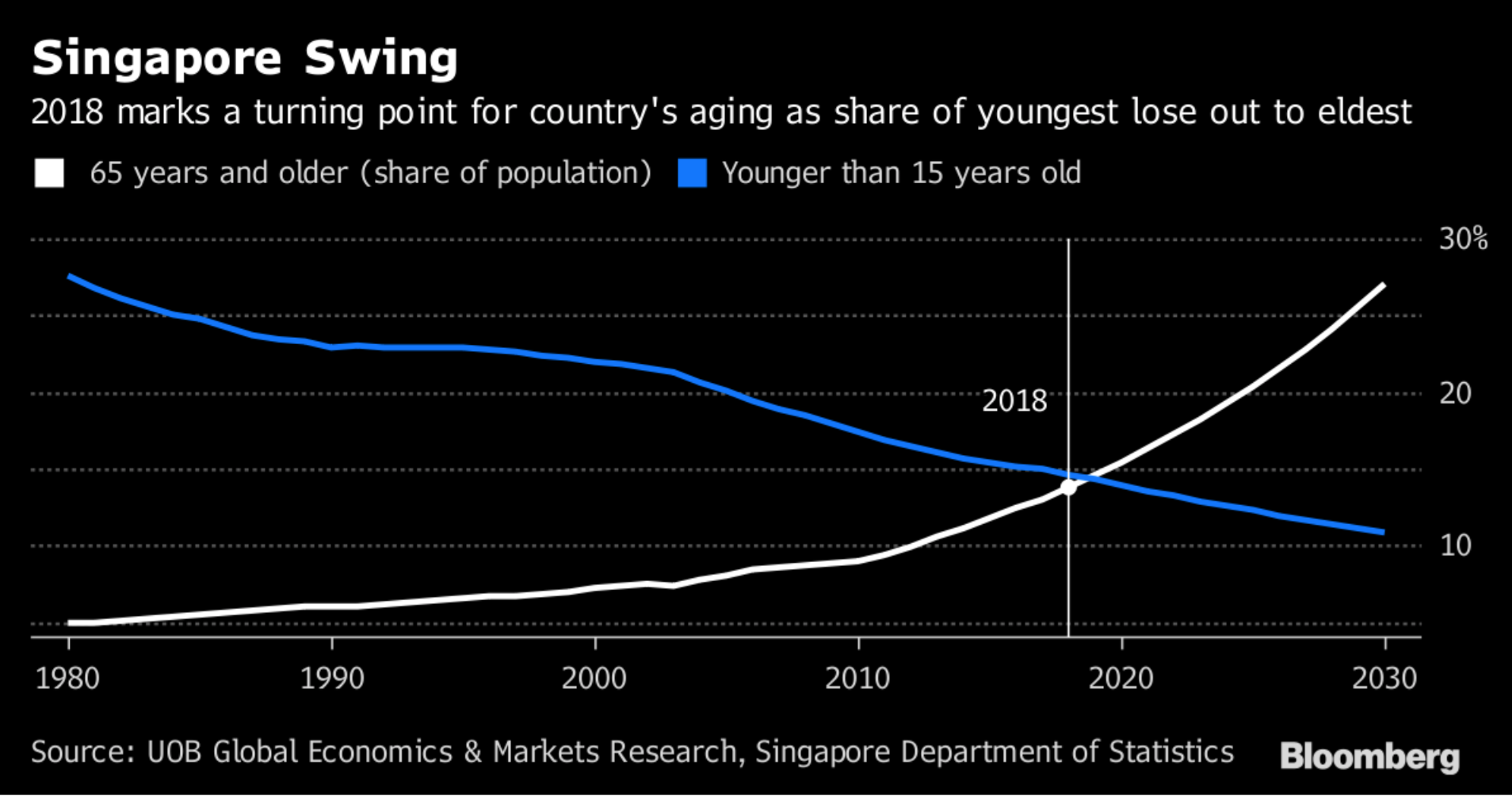 2018,新加坡将碰触人口红线。 65岁以上人口和15岁以下人口一样多。之后将可能步入日本陷阱。