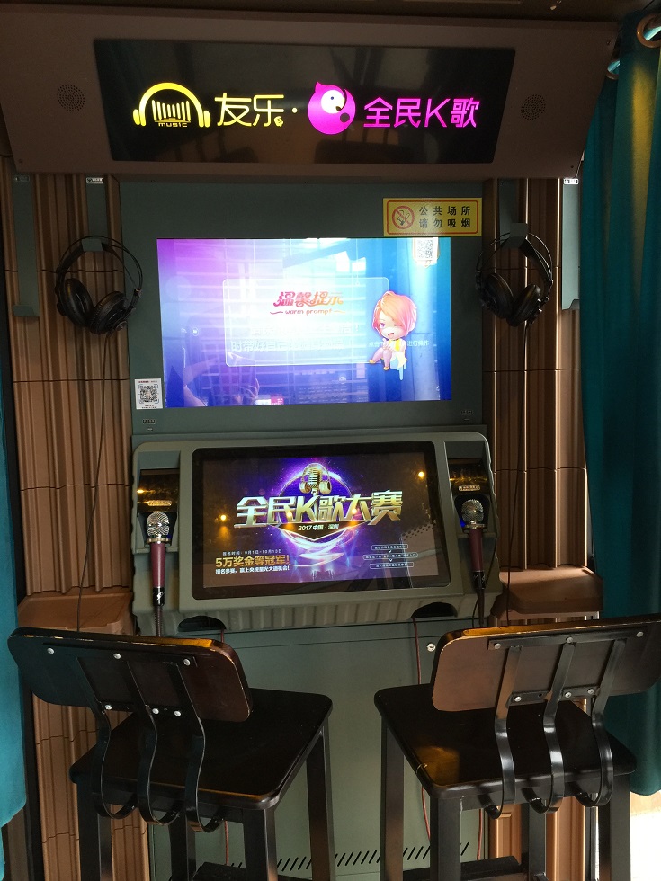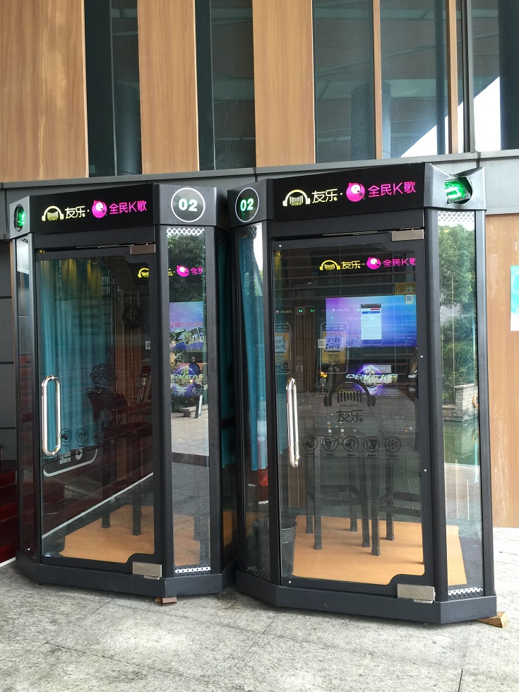 而小型KTV这种新鲜事物是在吃饭的餐馆旁边偶然发现的。吃饭的餐馆是在欢乐海岸,一个挨着深圳湾公园的大型综合餐饮之地。欢乐海岸环境很好,漂亮的欧洲小镇感觉。在那里的 皇后码头 吃饭居然也不贵,很美味的红烧乳鸽42元一只,韭菜炒海鲜(虾仁跟鱿鱼)58元,米饭3元,两个人90而已。在欢乐海岸时不时地出现几个像电话亭一样的小亭子,我仔细看居然是K歌用的。可以供两个人同时使用,干净有空调的小空间里挂着像专业录音的话筒跟耳机,微信扫码交费就可以用,20元15分钟。我于是又体验了一把专业录音的感觉。以下是欢乐海岸餐饮处以及K歌亭照片。