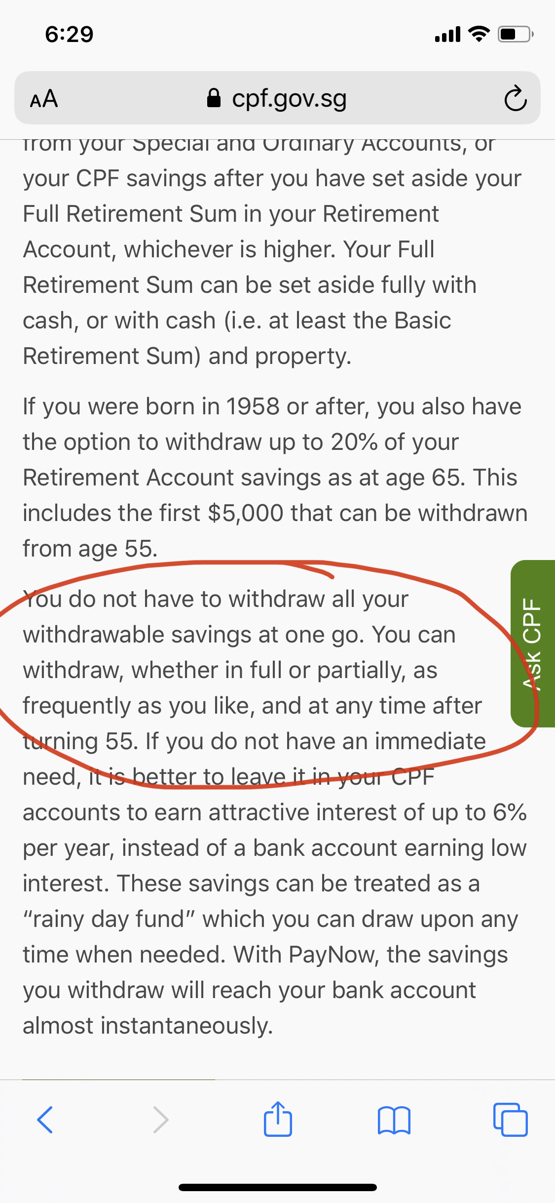 到55岁时,留够CPF life需要的retirement sum,剩下的balance就可以随时取了“到55岁时,留够CPF life需要的retirement sum (Basic Retirement Sum/Full Retirement Sum/Enhanced Retirement Sum), 剩下的balance就可以随时取了,CPF那时就变成了一个高利息的ATM。”