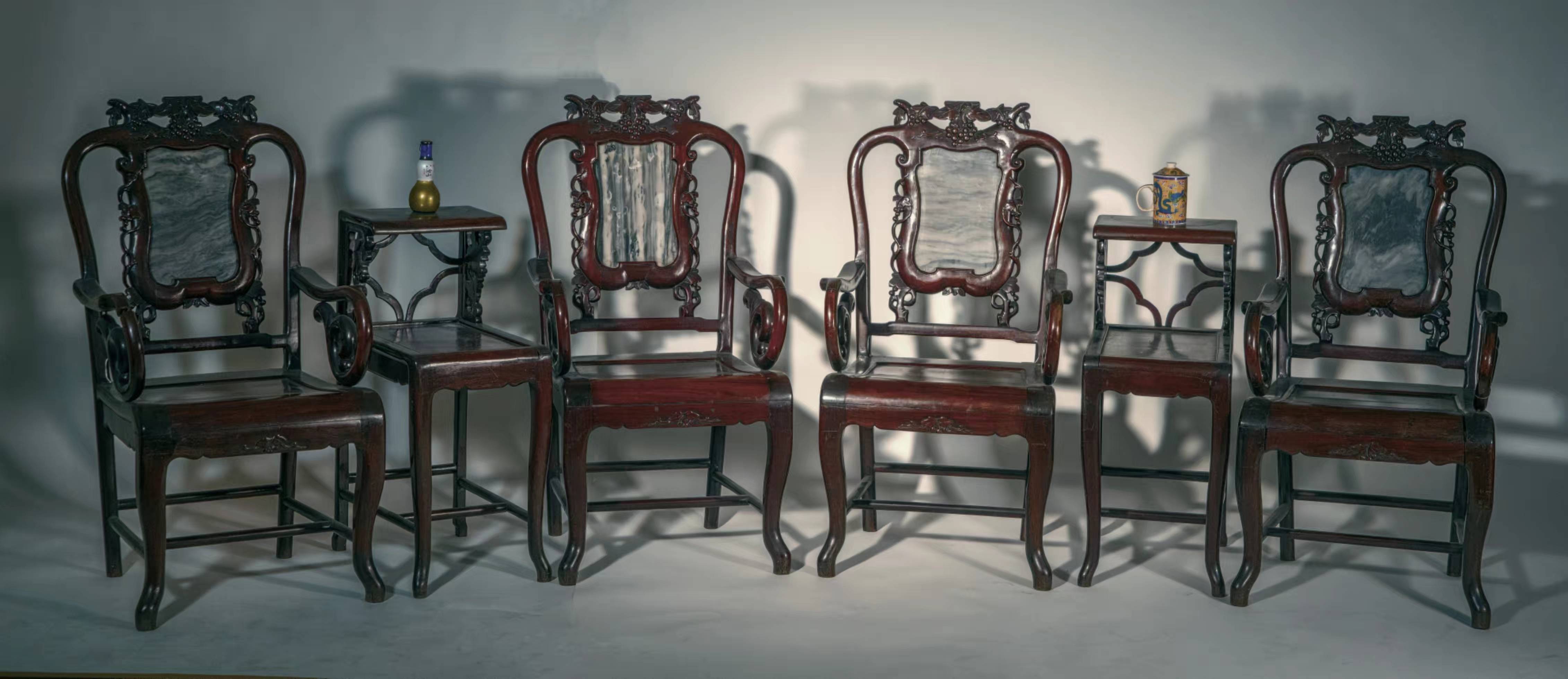 这套民国广作酸枝四椅两几这个是酸枝大理石,酸枝就是国家标准里面的交趾黄檀。民国时期做的,总共六件,算是传统的半堂家具。价格9k