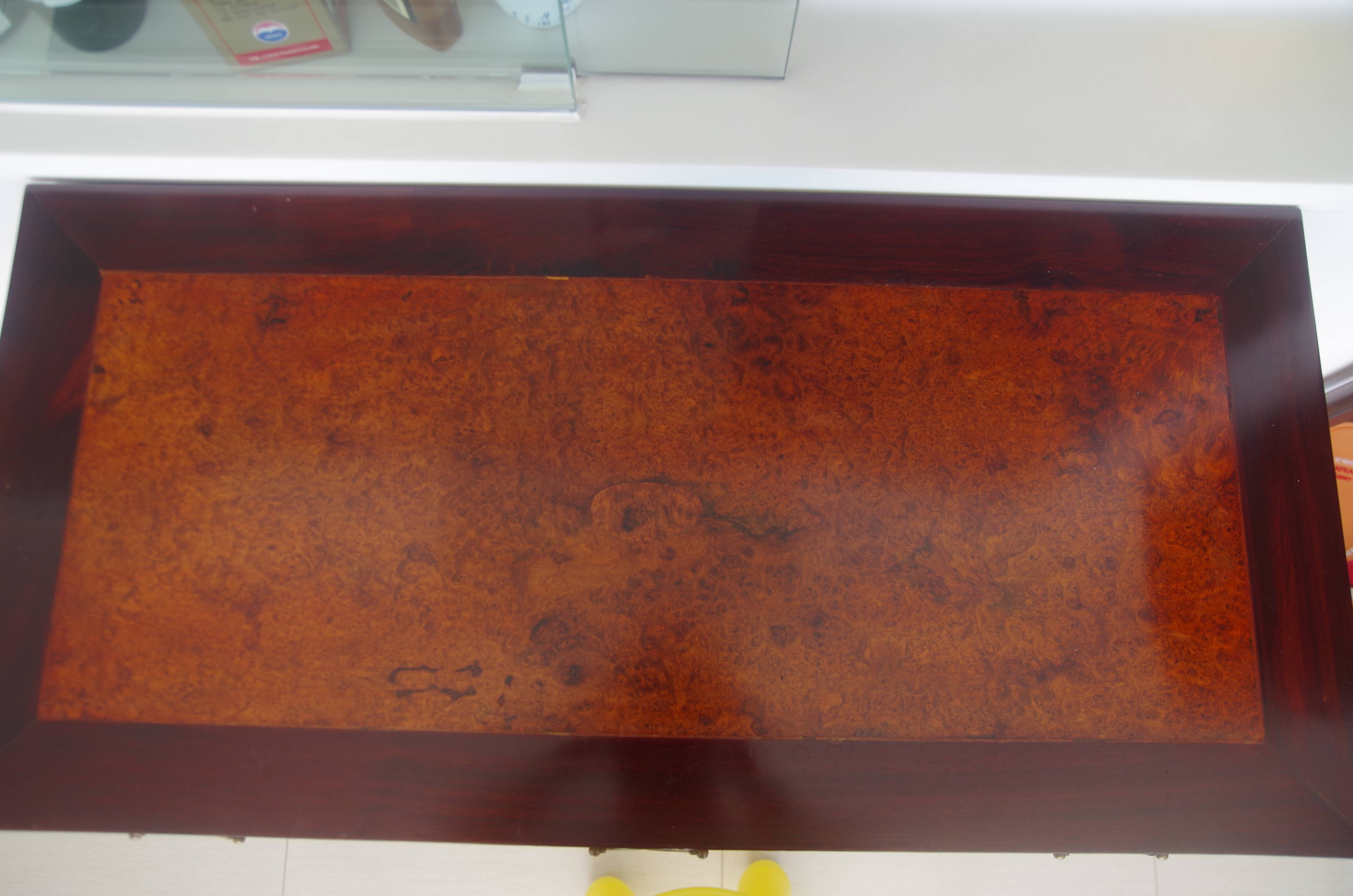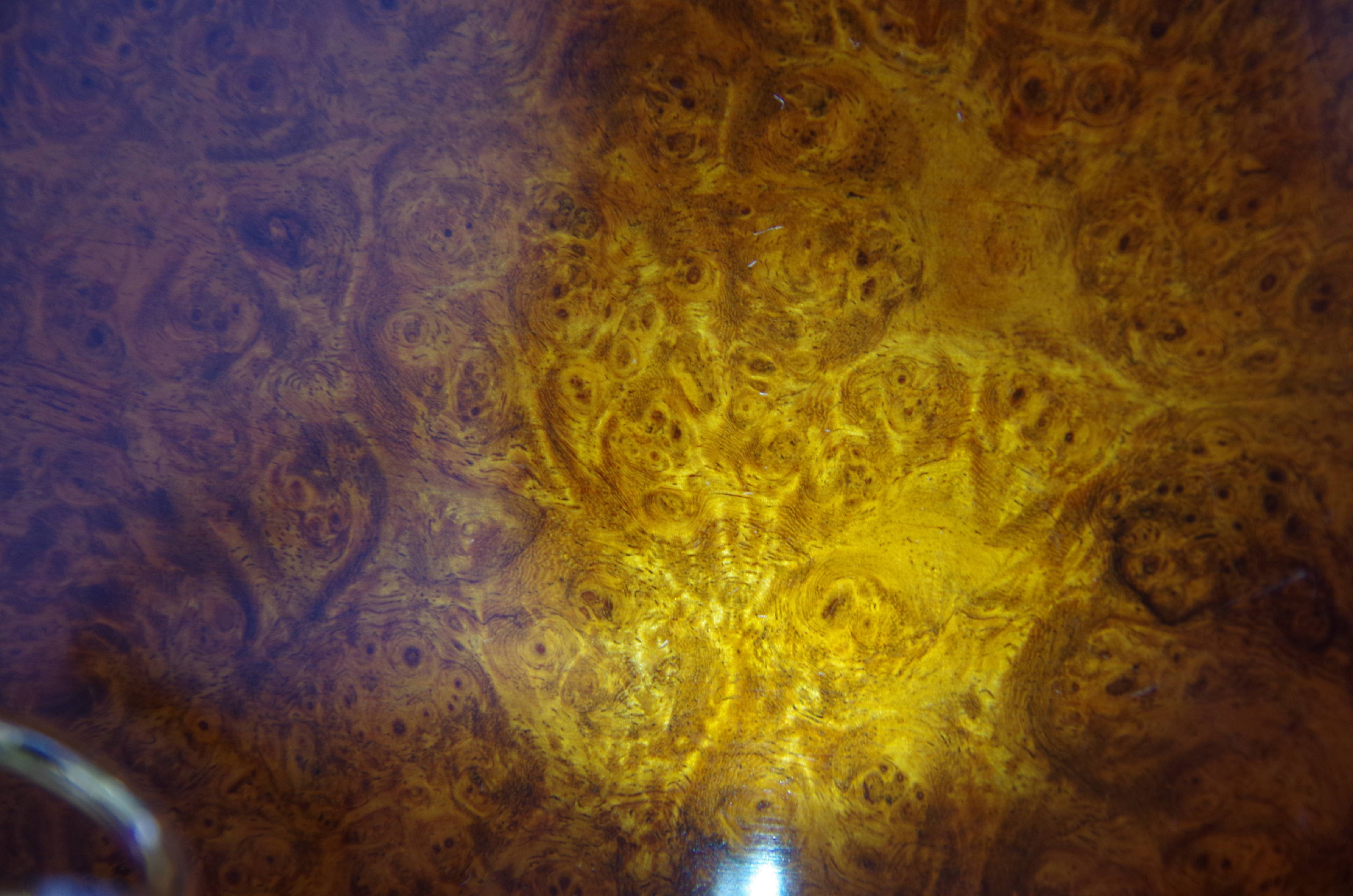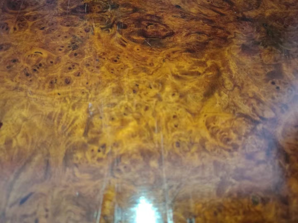 瘿木,就是树瘤,这个是花梨木的瘿木,纹路细小,晶莹剔透。 上品,所谓“满面胡花”,满架葡萄,大概葡萄大小的花纹。这桌面是全部瘿木,算得上是满面胡花