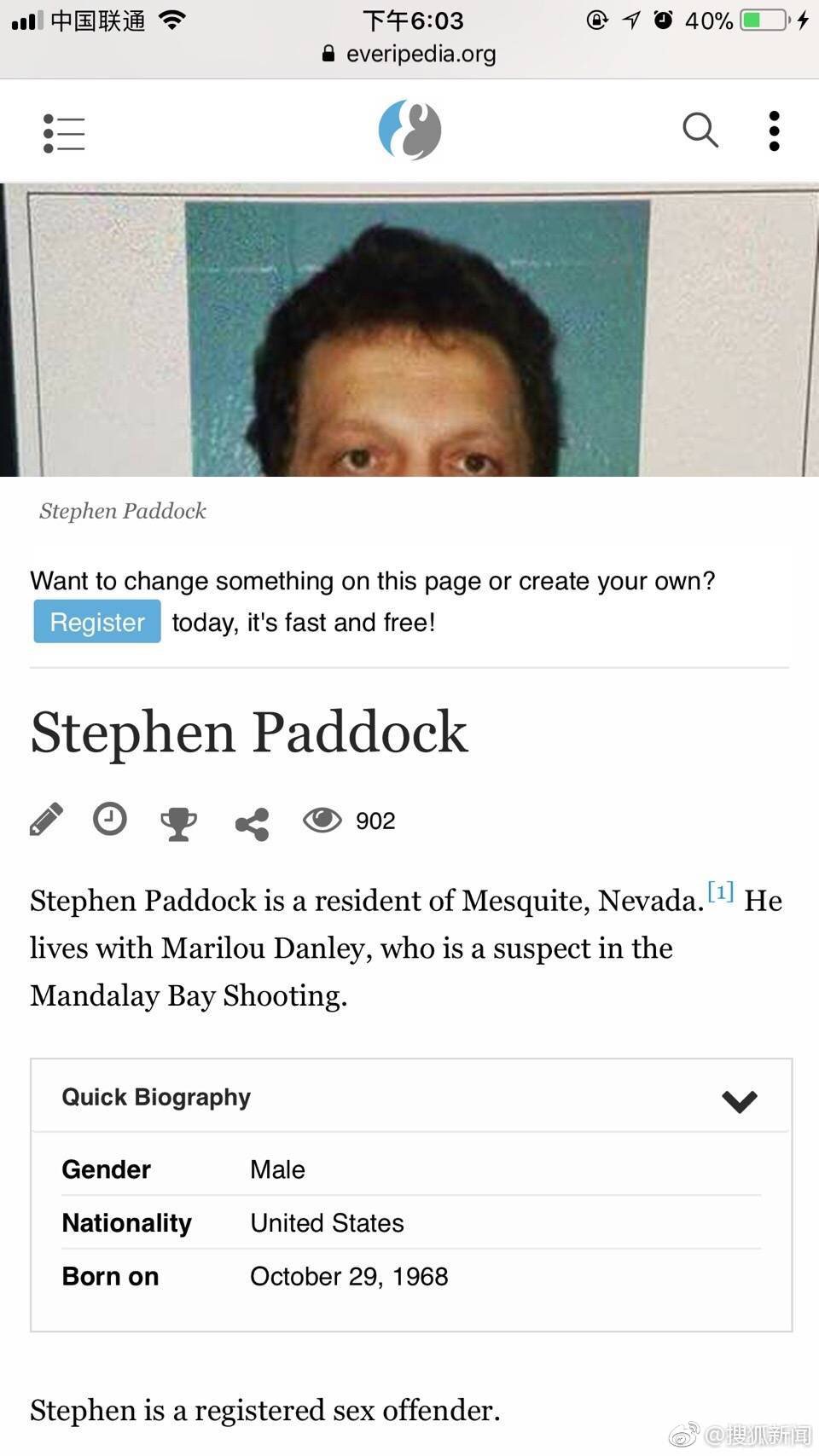 被人肉出详细资料警方尚未公布枪手姓名,不过很多网友通过人肉,推断凶手很可能是Stephen Paddock(1968年出生,是警方登记入册的sex offender性犯罪者)。Marilou Danley是他的室友,而她的老公是Geary Danley。
