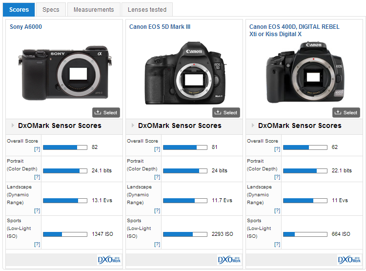 http://www.dxomark.com/Cameras/Compare/Side-by-side/Sony-A6000-versus-Canon-EOS-5D-Mark-III-versus-Canon-EOS-400D___942_795_184