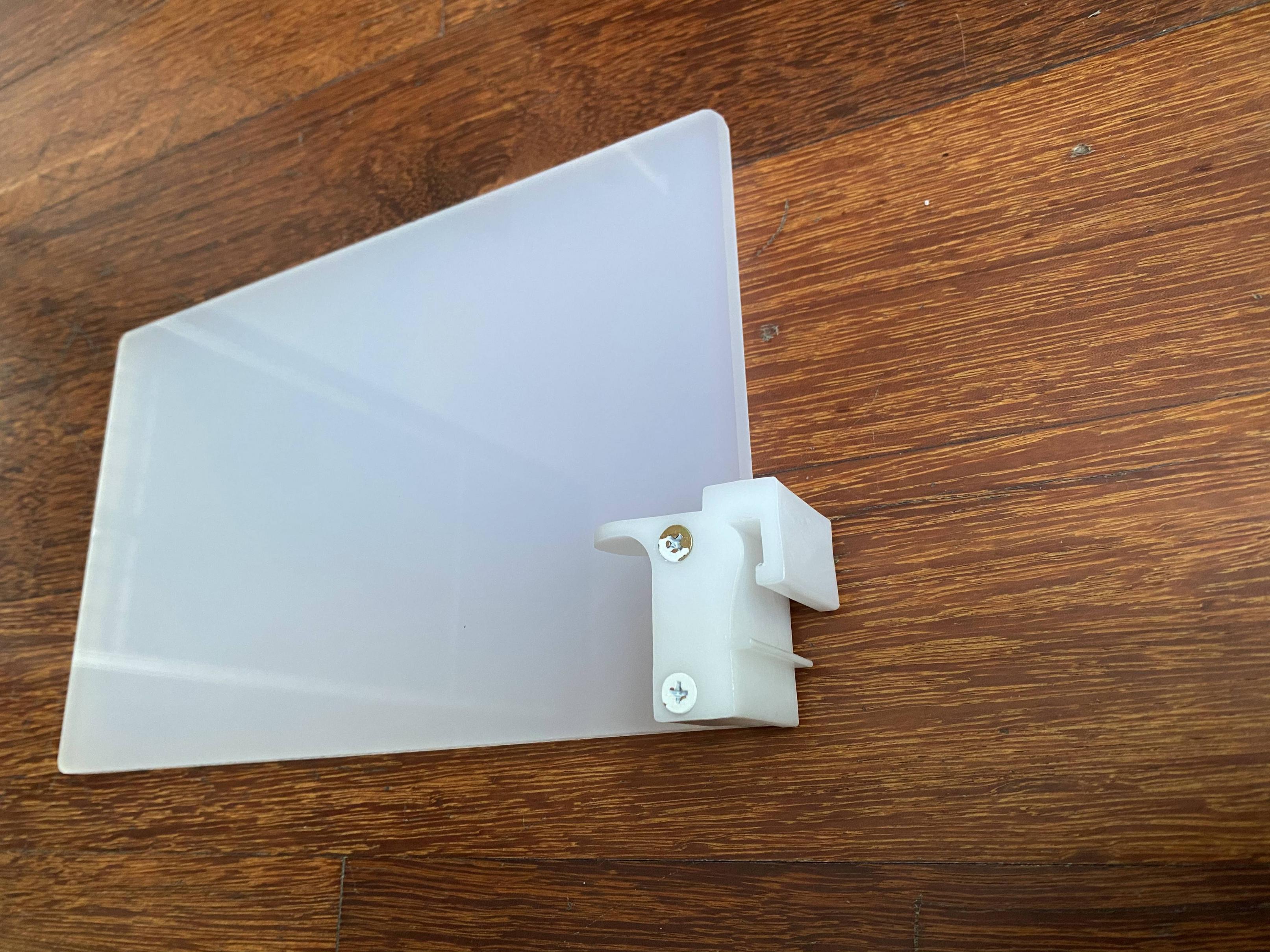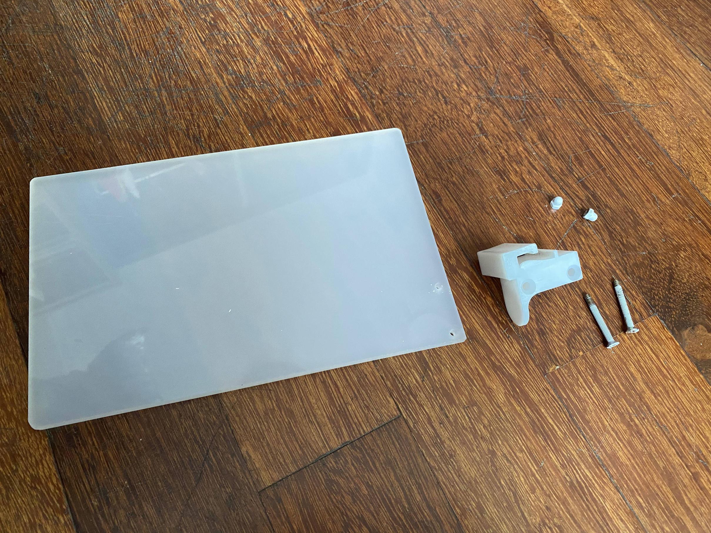 需要将如下图所示的零件(亚克力平板,螺丝和塑料夹子)安装成一个书挡,然后放在图书馆的书架上。