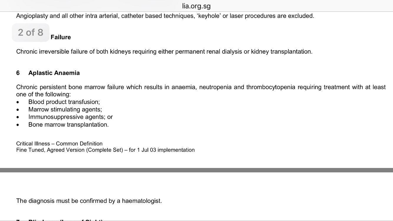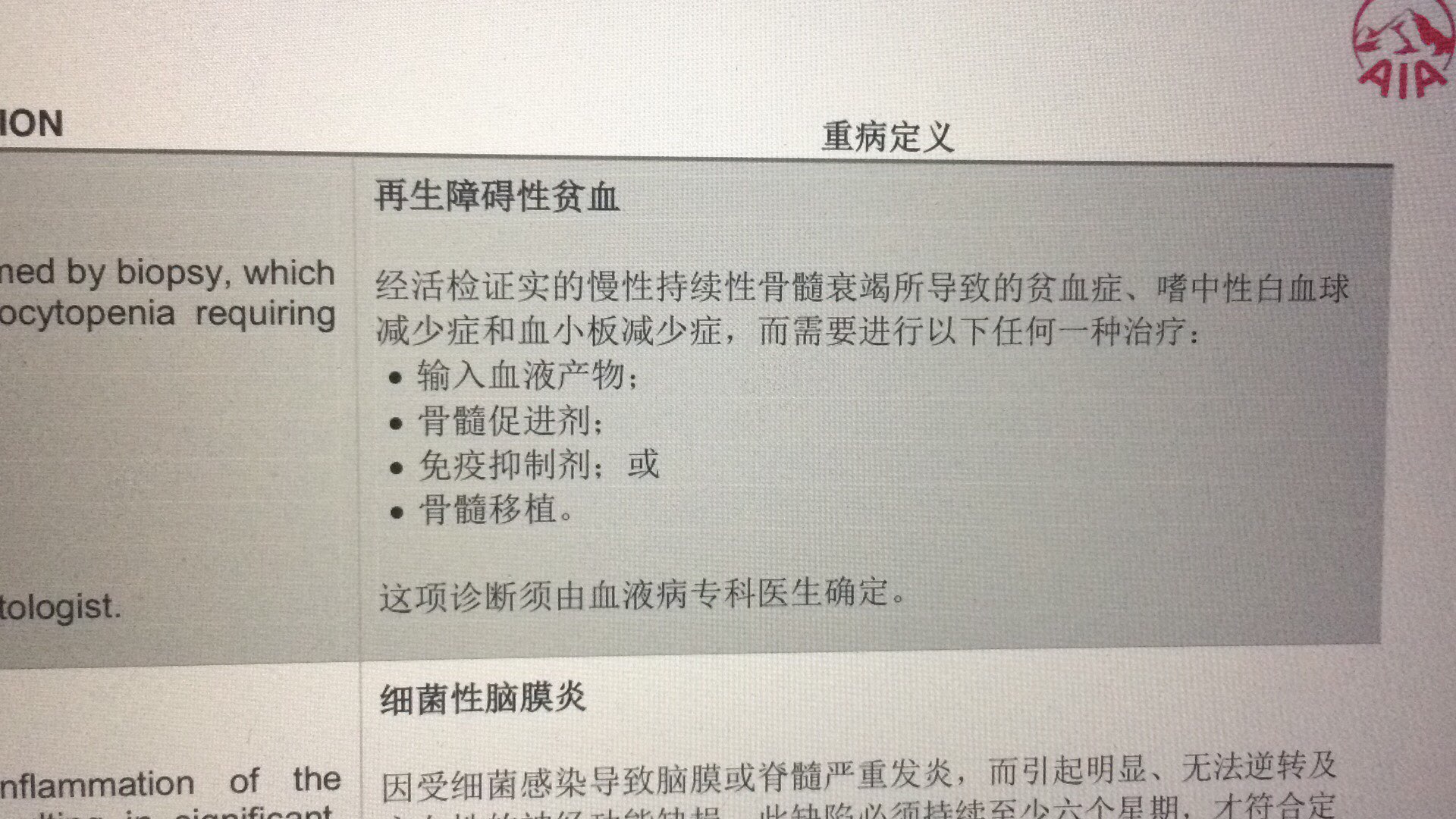 这个学弟的问题叫再障,如图片里定义,已完成骨髓移植,也在AIA定义大病范围内。
