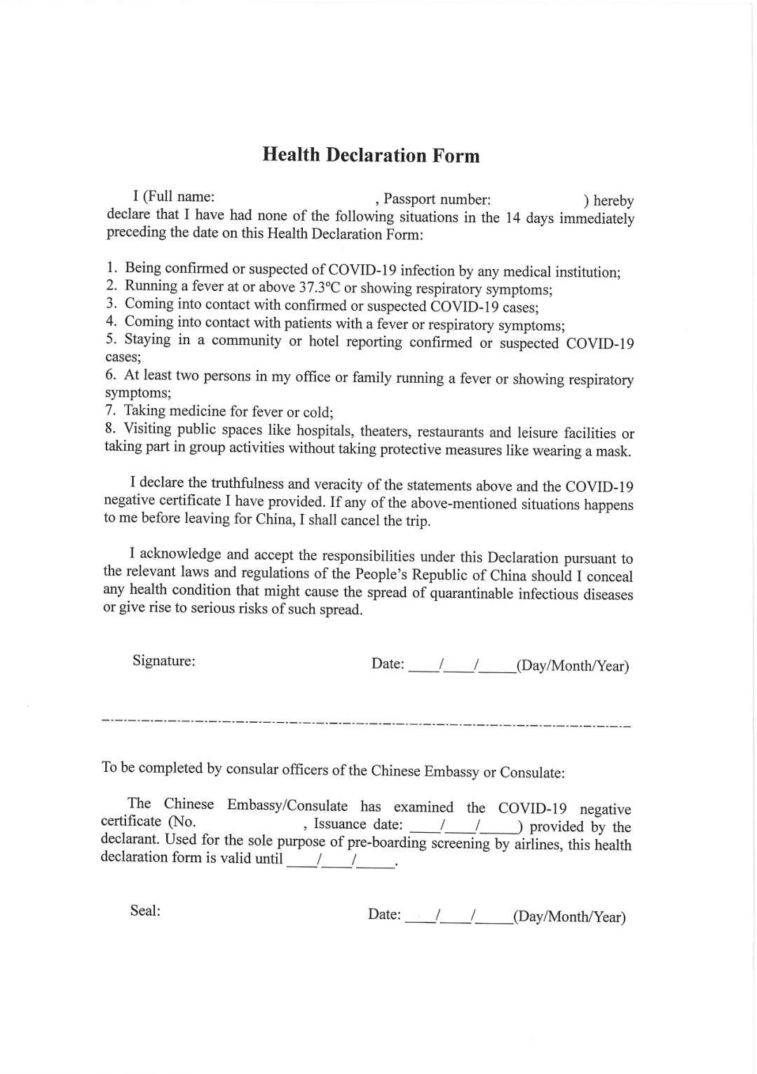 四、外国公民健康状况声明书办理办法外国公民应在获得核酸检测阴性证明后,将有效护照资料页、检测阴性证明和申请人已签字的健康状况声明书(式样见附件三)的扫描件,发送至中国驻新加坡大使馆指定电子邮箱:[email protected],邮件标题为:“HS+姓名+出发日期(YYYY/MM/DD)”,例如“HS+Lim Smith+20200826 ”。中国驻新加坡大使馆审核通过后,以电子邮件方式将加盖使馆公章的健康状况声明书扫描件发还申请人,请申请人自行打印并携带至机场。请注意在健康状况声明书有效期内乘机,并在登机前配合航空公司查验。五、重要提醒(一)如您无法及时完成核酸检测并获得检测阴性证明,登机前未能持有带“HS”标识的绿色健康码或有效健康状况声明书,则暂不符合乘机条件,需调整行程。(二)目前,新加坡暂不允许乘客经新加坡转机前往中国内地,且机场中转区暂不具备核酸检测条件。因此,请有计划在新加坡转机赴华的乘客关注新加坡有关航空公司的网站,购票前务必与前、后段承运航空公司确认中转路线是否可行;如与航空公司确认可行,请务必在始发地获得带“HS”标识的绿色健康码或健康状况声明书,并在绿色健康码或健康状况声明书有效期内中转乘机,避免不必要的经济损失或滞留的风险。(三)对搭乘航班自新加坡出发、经由其他国家中转、最终目的地为中国的乘客,亦须按照上述要求准备有效的健康码或健康状况声明书,否则可能导致中转时无法登机。(四)带“HS”标识的绿色健康码有效期以检测证明的出具日期为起始点进行计算。因核酸检测出具结果仍需一定时间,请拟搭乘赴华航班的中国籍乘客合理安排核酸检测时间,如获得检测结果,请第一时间通过防疫健康码国际版微信小程序拍照上传,尽量避免在登机当日或前一日才上传检测证明,耽误个人行程。如遇周末或公共假日出发航班,请尽可能在假日前一个工作日15:00前提交。(五)如核酸检测报告没有编号,请乘客在检测报告编号栏填写“NA”代替。(六)提醒所有乘客严格遵守相关防疫法律法规,务必提供真实有效的核酸检测证明。伪造核酸检测证明将承担相应法律后果。(七)申请健康状况声明书和申办签证不互为前提。附件一:“防疫健康码国际版”微信小程序二维码附件二:健康码不同状态的样式