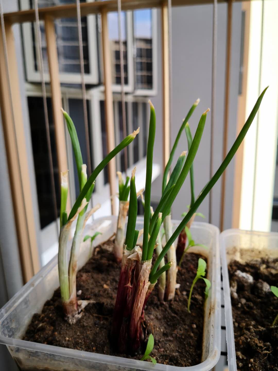 上次是家里的女佣用饭盒装点土种的,长出来的葱叶昨天已经摘掉吃了,
