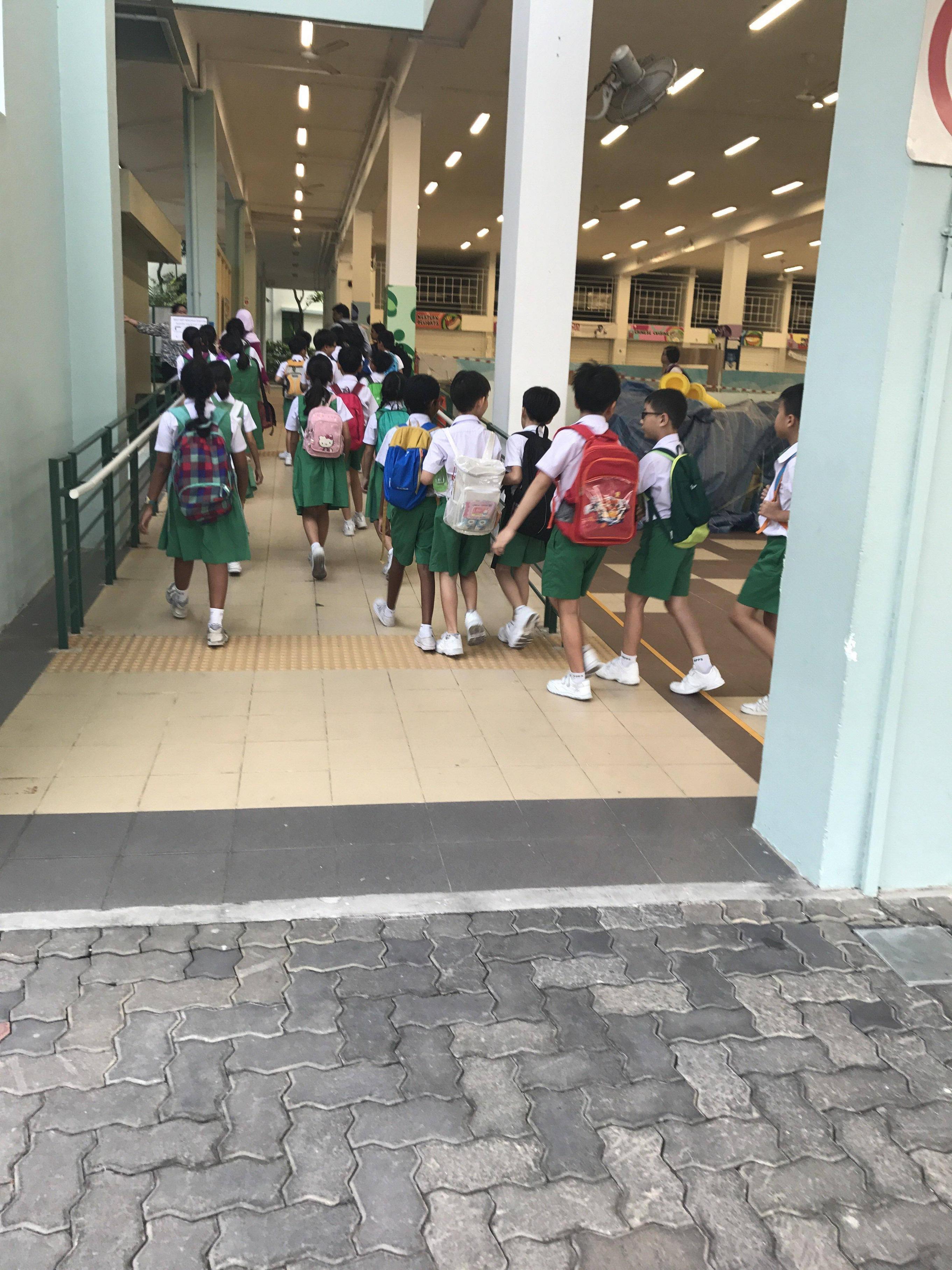 目测华人小孩居多只有那个扎大辫子背格子书包的是印度女孩