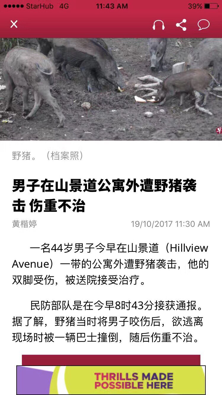 新加坡的野猪感觉是野化的家猪不是那种山里面那种獠牙铮铮的正宗野猪。那种要人命是秒秒钟的事