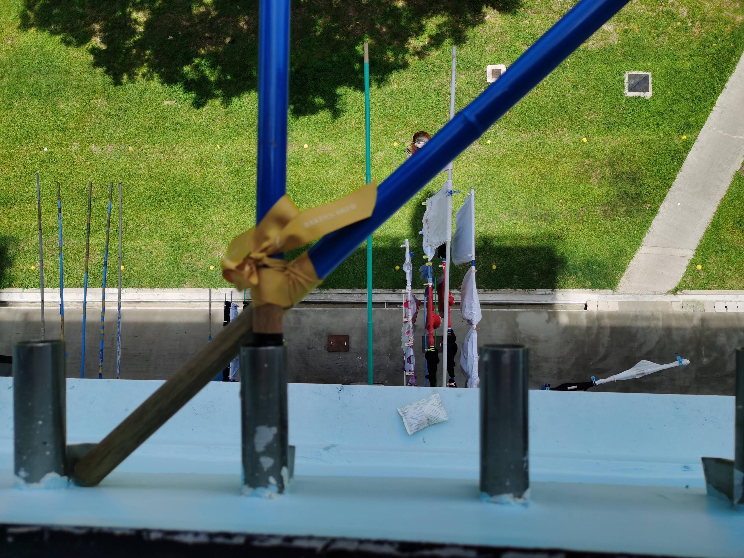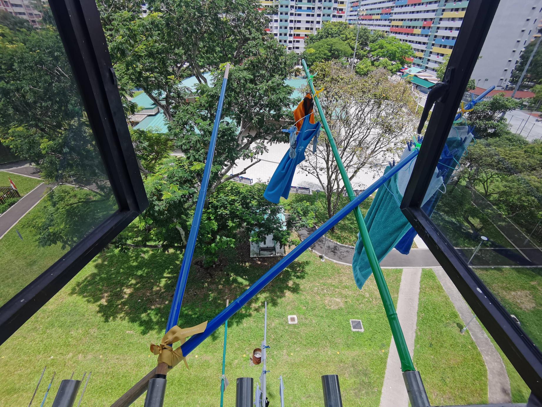 朋友给支招这个,算是解决了烦恼。给大家分享。,相信你看图就知道了。要注意要固定紧 确保不会被风吹掉下去或者吹到hdb外墙那弄脏。