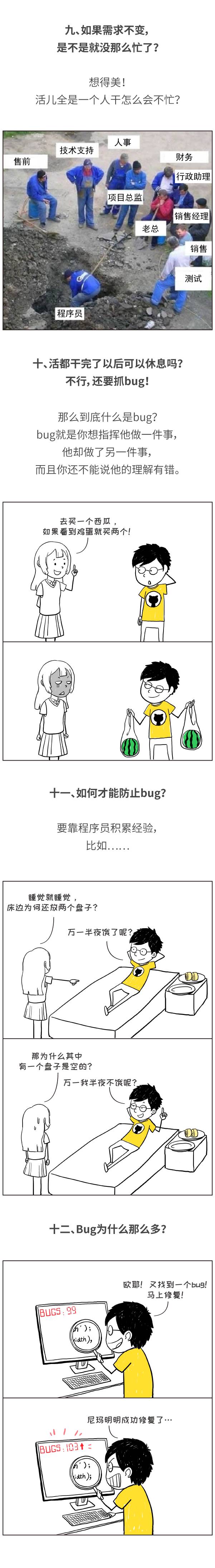 “十年编程两茫茫,工期短,需求长。千行代码,Bug何处藏。纵使上线又如何,新版本,继续忙。黑白颠倒没商量,睡地铺,吃食堂。夜半梦醒,无人在身旁。最怕灯火阑珊时,手机响,心里慌。”