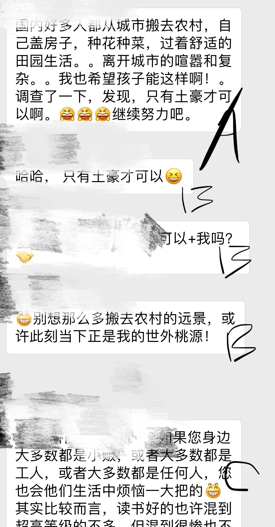 4. 有个妈妈A,一边问比赛,问网课,一边说哎呀,我不要娃娃压力,不要她猝死,只要我家娃娃幸福快乐就好,最后再神总结,国内好多从城市回到农村过田园生活,最后发现,哎哟只有土豪可以酱紫啊,嗷嗷嗷,我们还是继续努力吧~(吃瓜群众表示一脸懵逼)