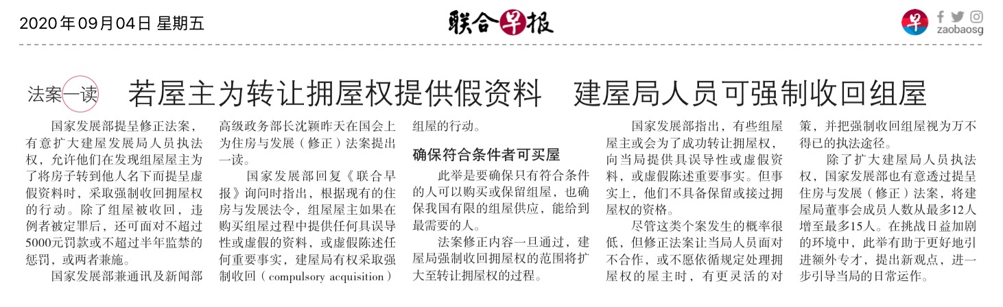 国家发展部回复《联合早报》询问时指出,根据现有的住房与发展法令,组屋屋主如果在购买组屋过程中提供任何具误导性或虚假的资料,或虚假陈述任何重要事实,建屋局有权采取强制收回(compulsory acquisition)组屋的行动。此举是要确保只有符合条件的人可以购买或保留组屋,也确保我国有限的组屋供应,能给到最需要的人。法案修正内容一旦通过,建屋局强制收回拥屋权的范围将扩大至转让拥屋权的过程。