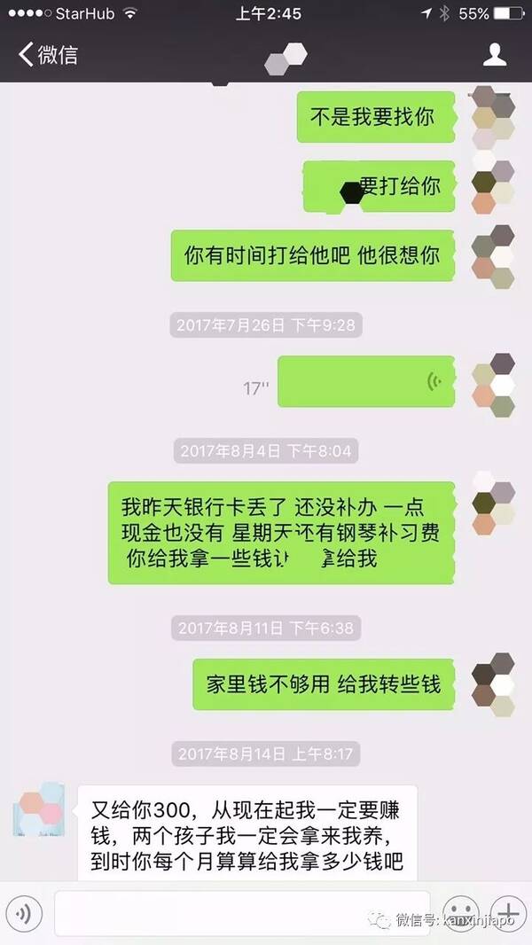 此时在他对外界的讲述中,我已经变成了一个只会找他要钱的怨妇。然而每次讲孩子需要补习费时,他会说“你是孩子的妈妈,他们也是你的孩子,你拿钱应该的”, “别跟我要钱,你没钱就别给他们补习,把孩子的补课全部都停了”,“我是肯定没有钱,你们都挺着吧”。他还对外界说我是泼妇,颠倒是非的人,而且发很多语音和文字信息威胁我。