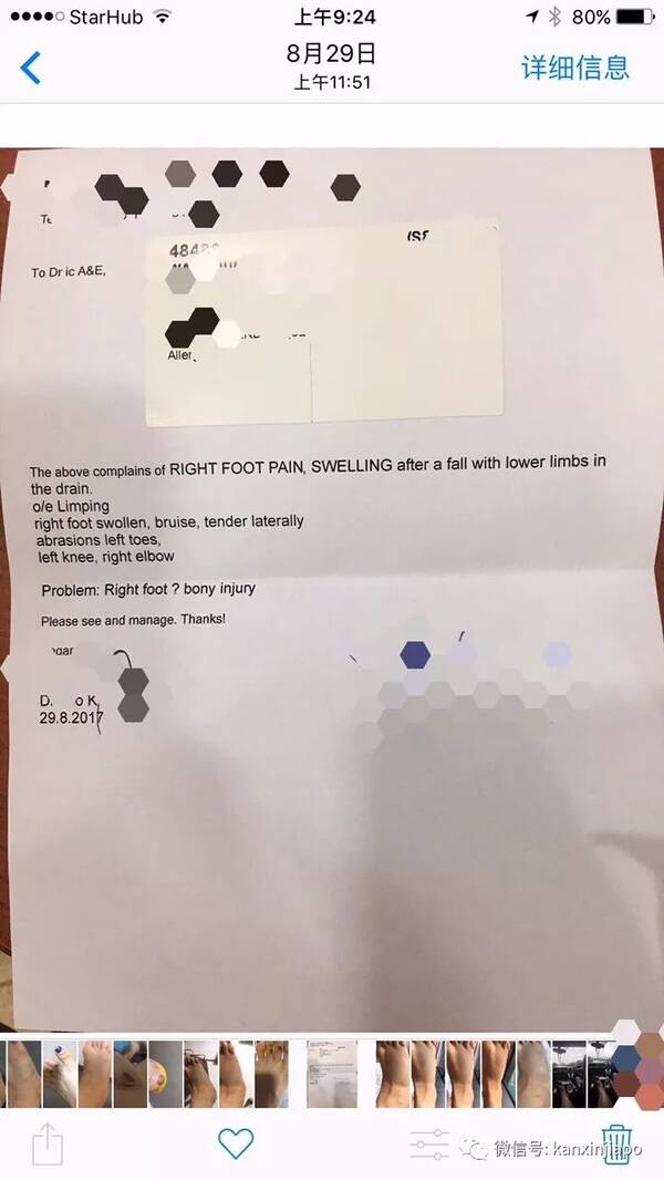 他打电话过来,我说我脚很痛,必须去医院,他让我在楼下等他,结果我在家楼下等了三个小时,他的手机已经关机,当时我很冷,脚钻心地痛,我让路人扶我上楼,第二天去新加坡中央医院检查结果是粉碎性骨折,到现在已经两个多月还需要拄着双拐。