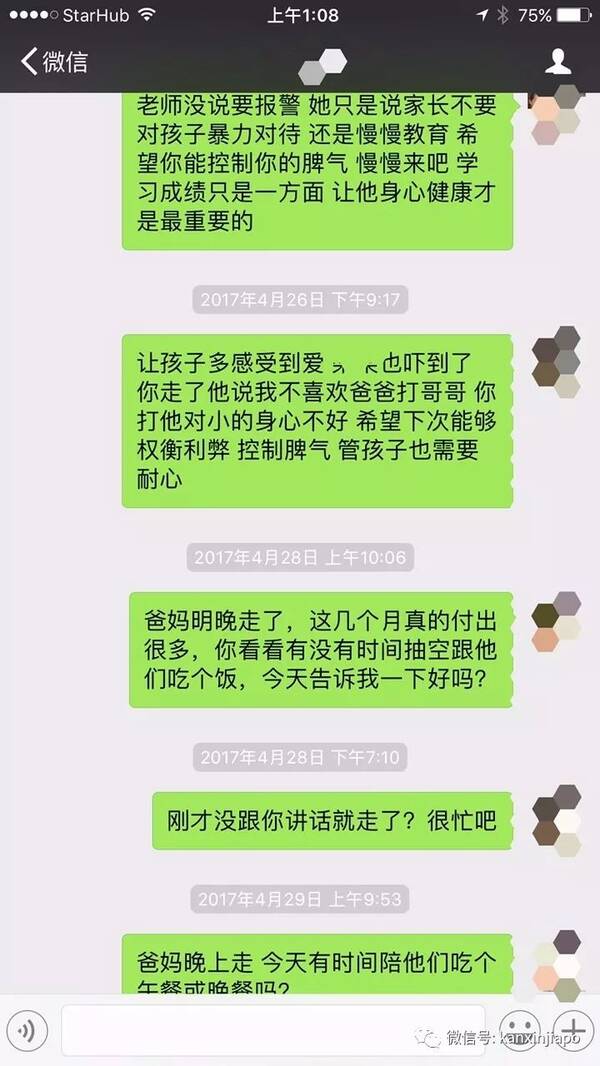 我父母2017来新加坡时,他也打过一次孩子,下手很重,他在电话里跟我喊“让老师报警啊!我打自己孩子有什么错?”我发了很多信息给他,他也并未回复。