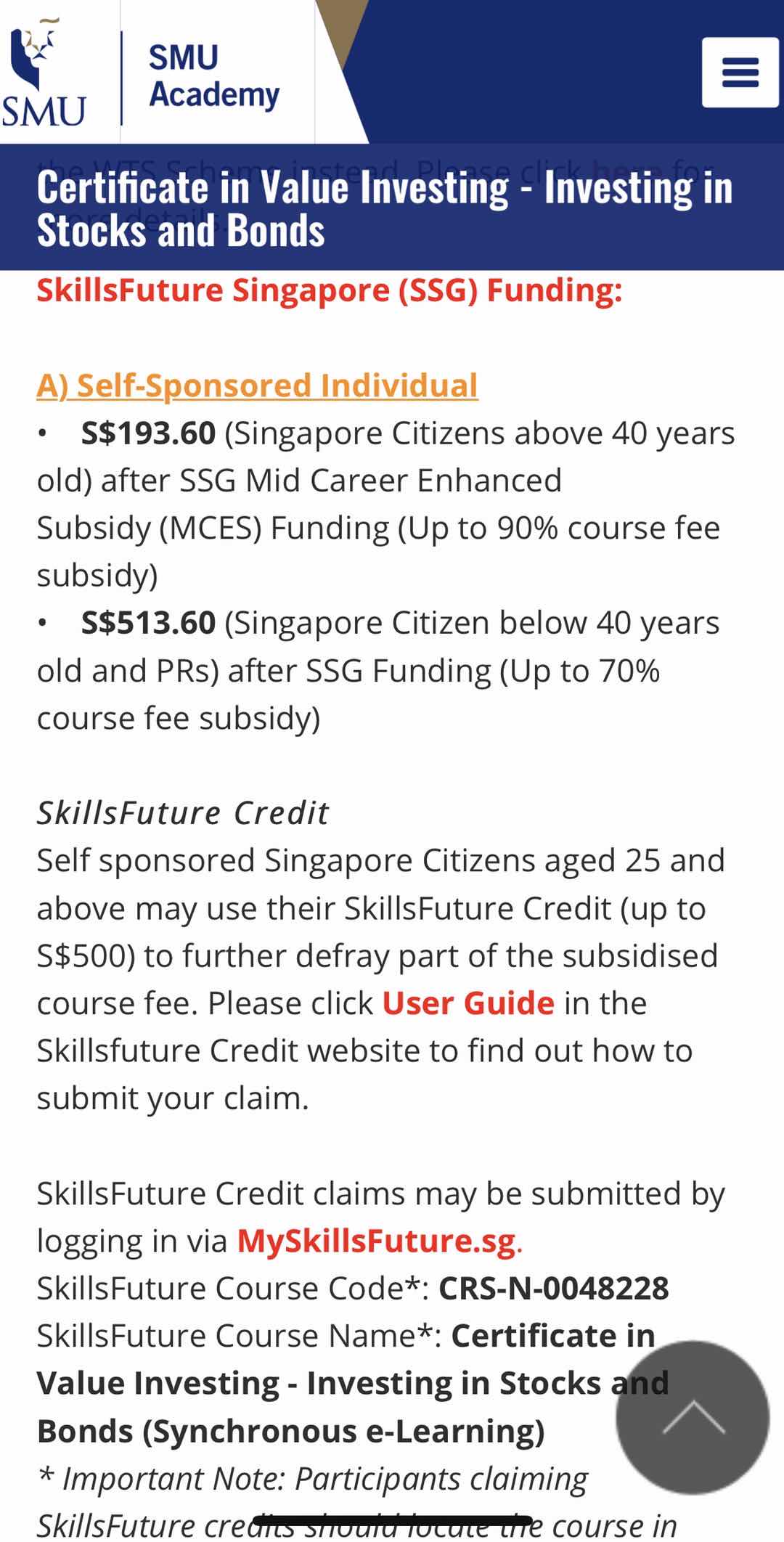 要区分下SSG funding和SKillsfuture creditSSG funding是符合要求(公民或PR)自动扣了