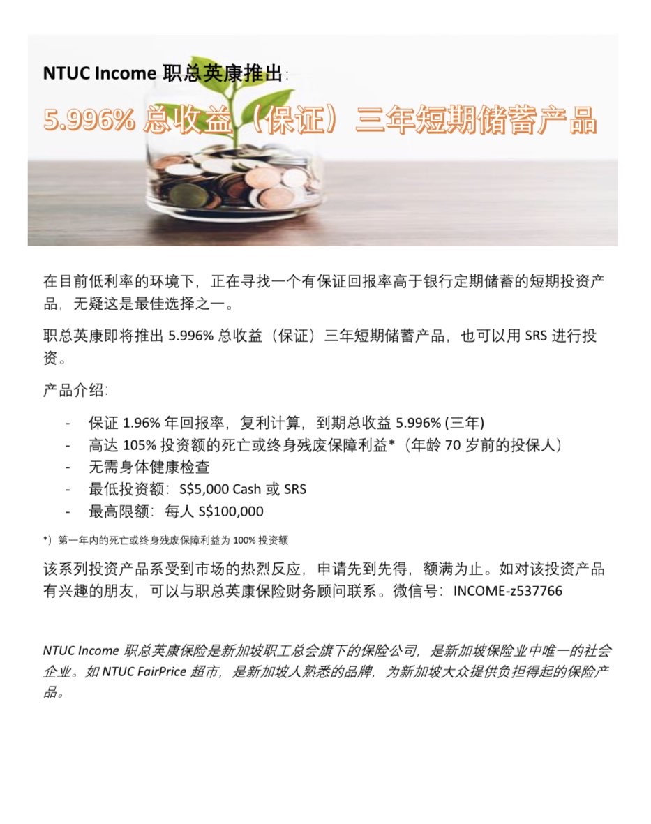 NTUC Income 月底推出新一期保证回报率的短期储蓄计划