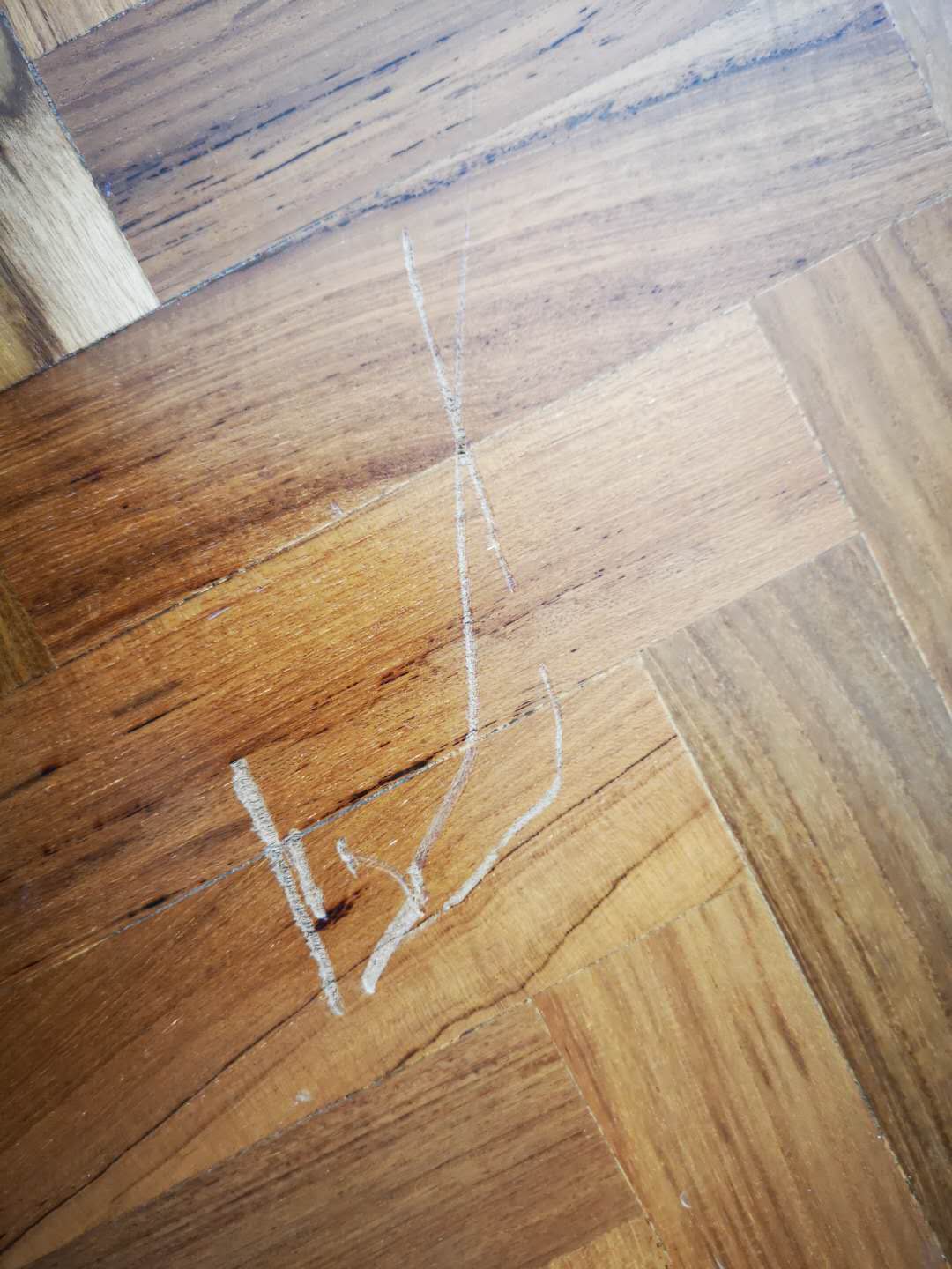 frog2009 • • 9994 次浏览求助 刚磨过的木地板,被钉子划的划痕很深,划痕好几道,有些很深能看到白白的木色了,有些浅一些但是也有一个坑,能有20cm长了,能怎么修补一下吗?